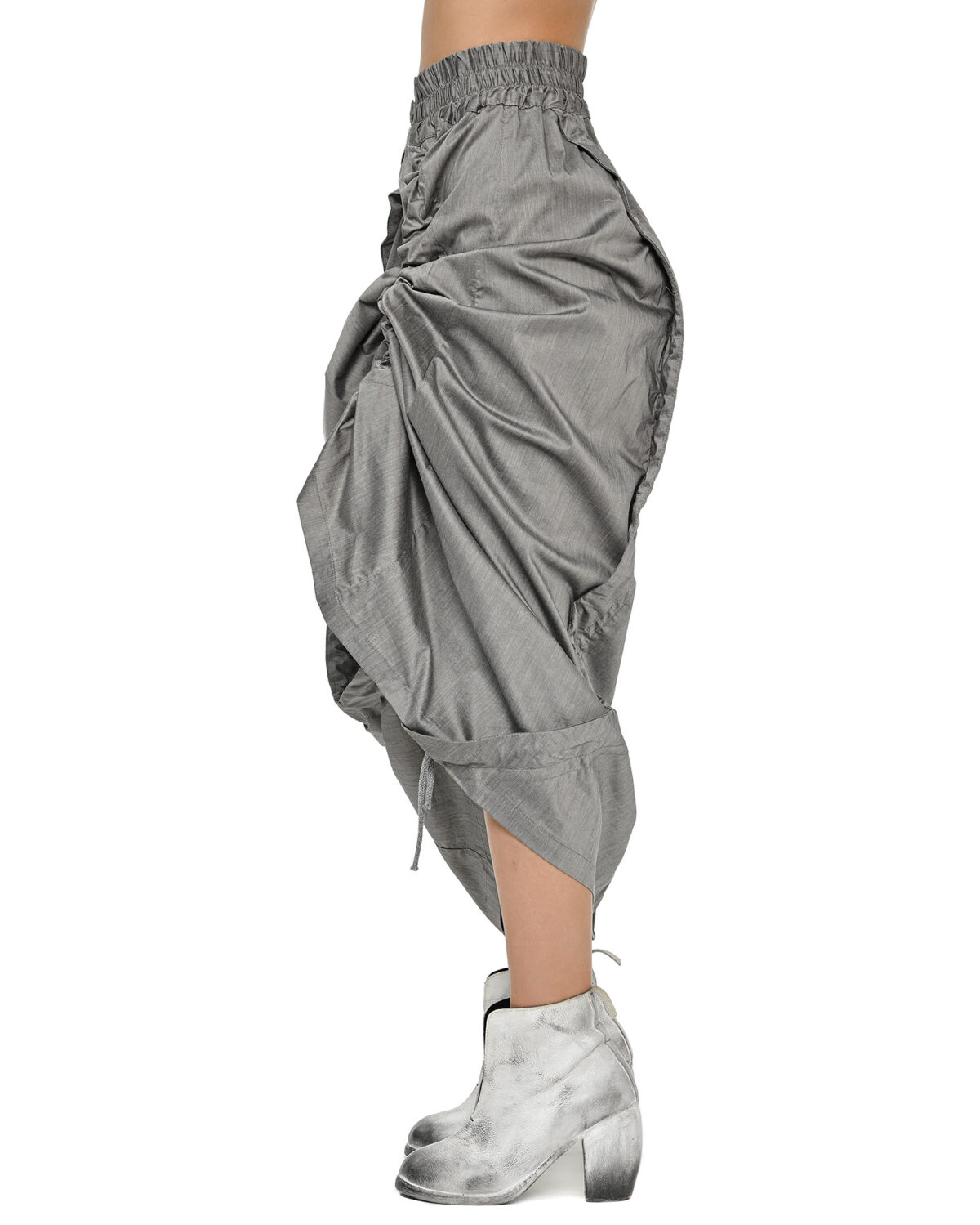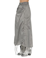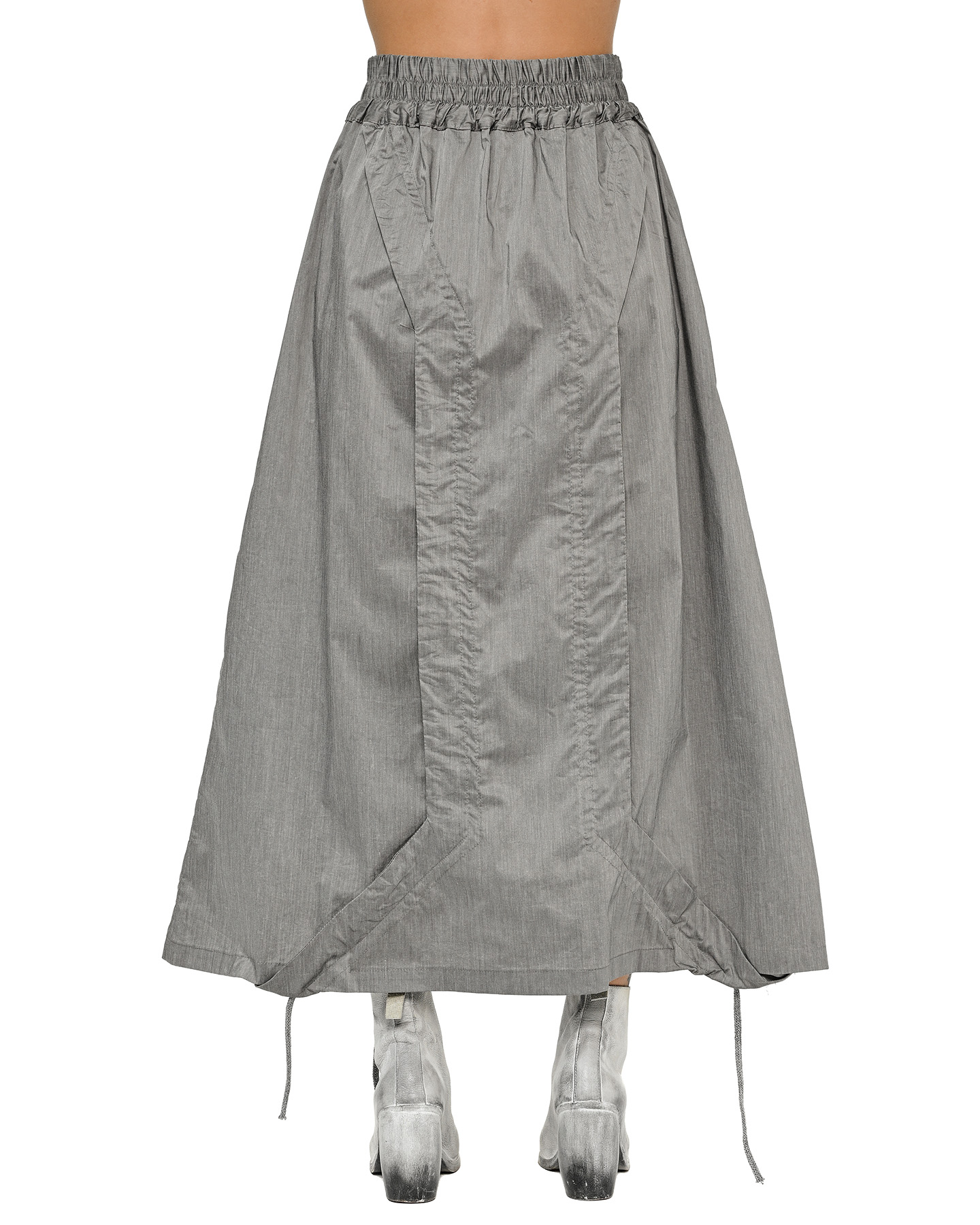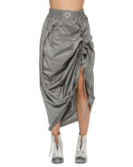 The Inox Adjustable Stellar Skirt achieves its relaxed, flared silhouette through a geometric cut in lightweight, muted Inox grey satin, cinched by an elasticated waistband with a signature hexagon steel buckle.