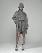 Der Inox Adjustable Stellar Rock erzielt seine legere, ausgestellte Silhouette durch einen geometrischen Schnitt aus leichtem, gedämpftem Inox-grauem Satin, zusammengehalten von einem elastischen Bund mit charakteristischer Hexagon-Stahlschnalle.