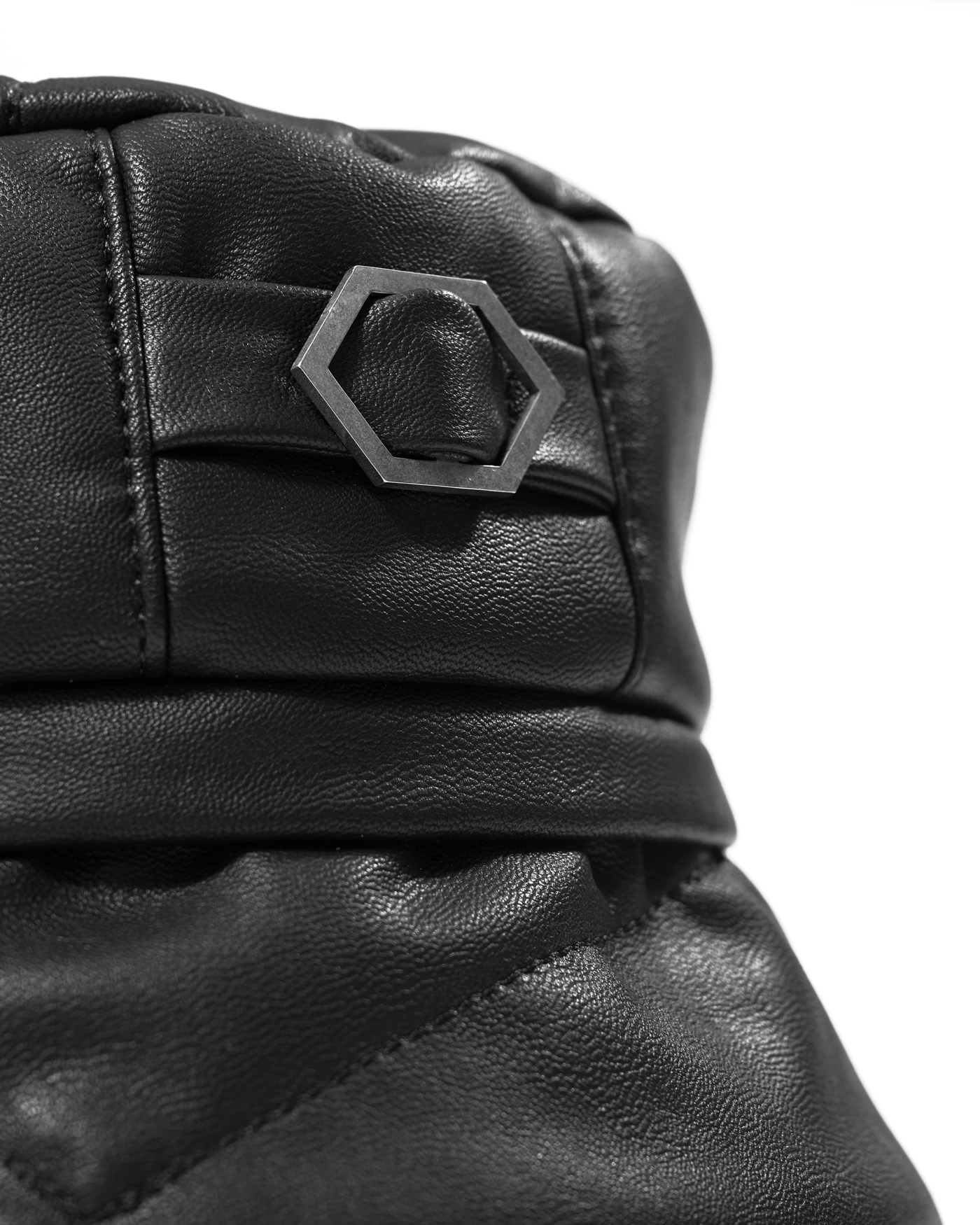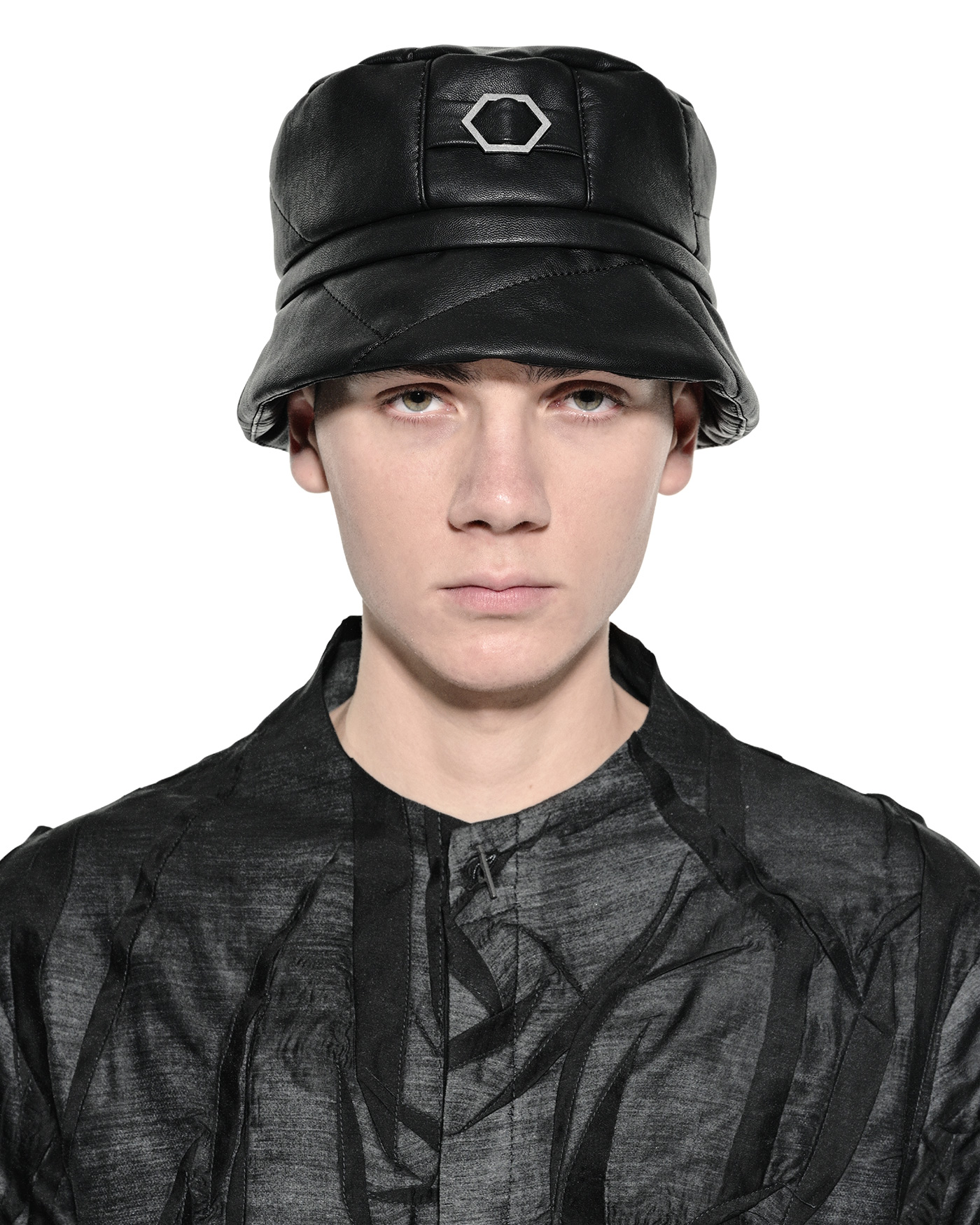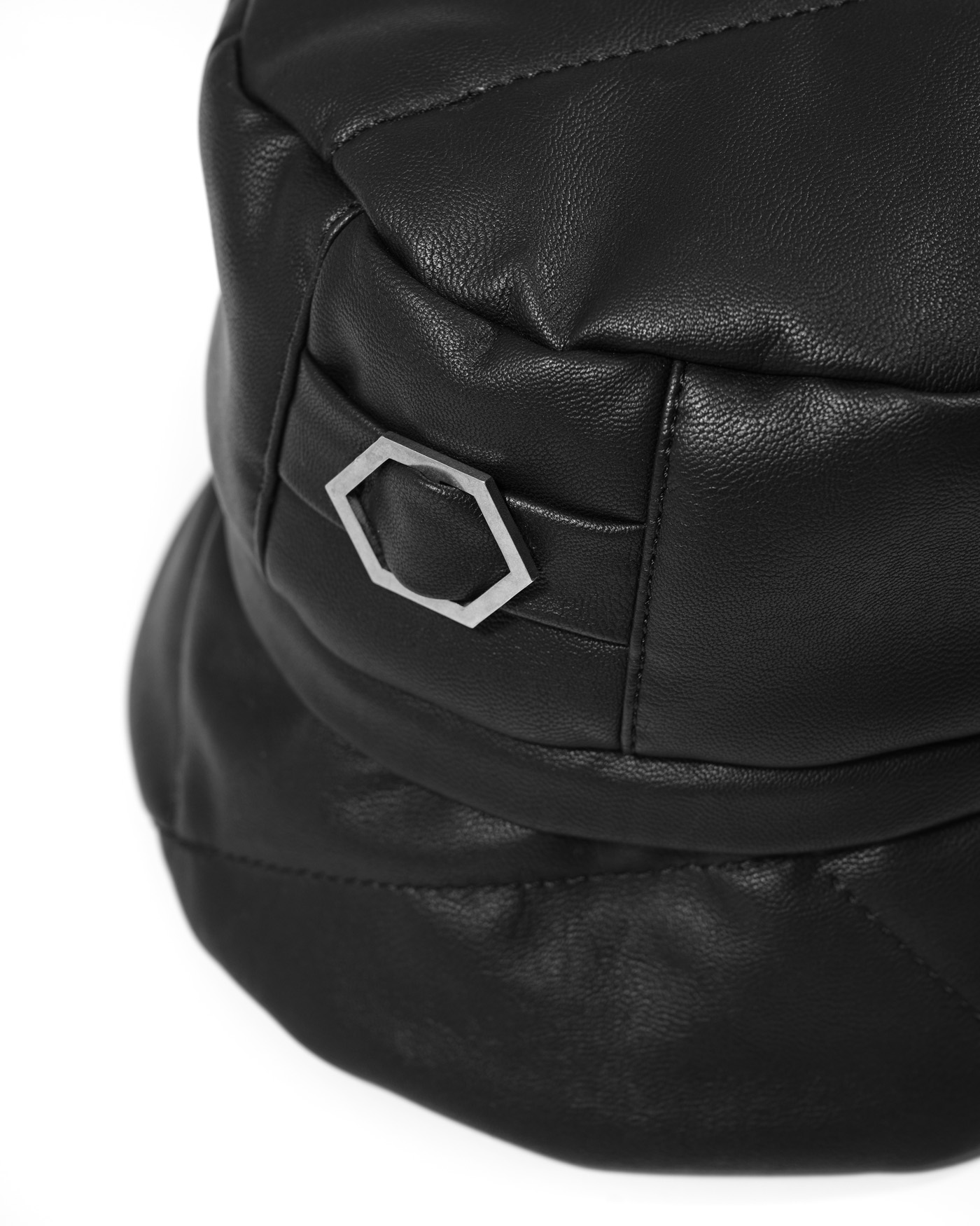 Constructed from durable vegan leather, the Leather Segment Bucket Hat features signature linear quilting over stabilizing inner wadding, creating a precisely defined silhouette that culminates in a narrow, downward-sloping brim.