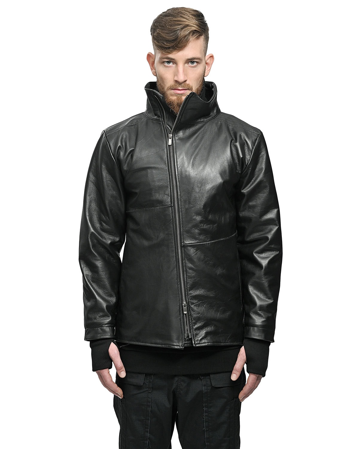 An archive leather biker jacket brought back to life from collection ‘Within’ S/S 18. This high neck jacket is crafted in a multi-segment, scar stitch technique shaping one biker style silhouette with armour-like feel. The slim fit silhouette is wide enough to allow freedom of movement, especially for layering garments underneath. Fully lined in black cotton and featuring four pockets, three of which with YKK zips for safeness and practicality.