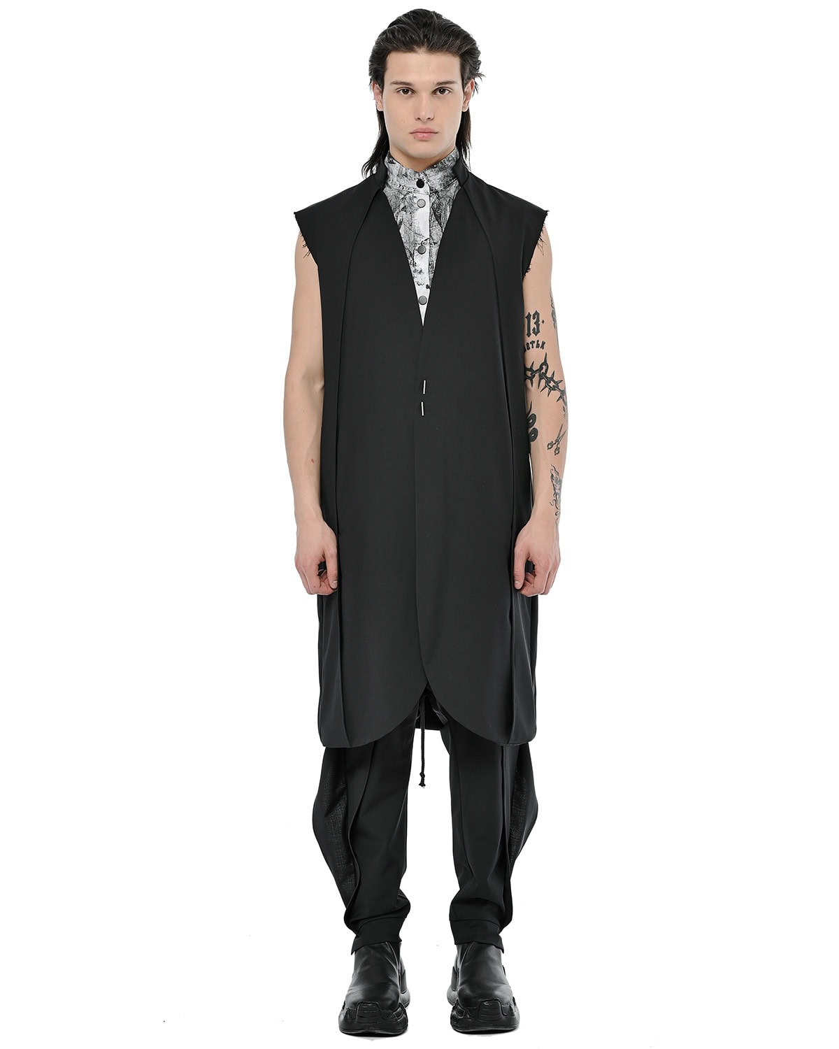 The Linear Trigon Layers Vest is defined by its signature ‘Trigon’ descending layers at both front and rear, creating a relaxed, elongated silhouette with a raw edge sleeveless finish. Fastened with two front linear handcrafted steel buttons, it features a deconstructed collar, accented by a Minoár hexagon steel buckle, and discreet diagonal cut welt pockets under the front layers.