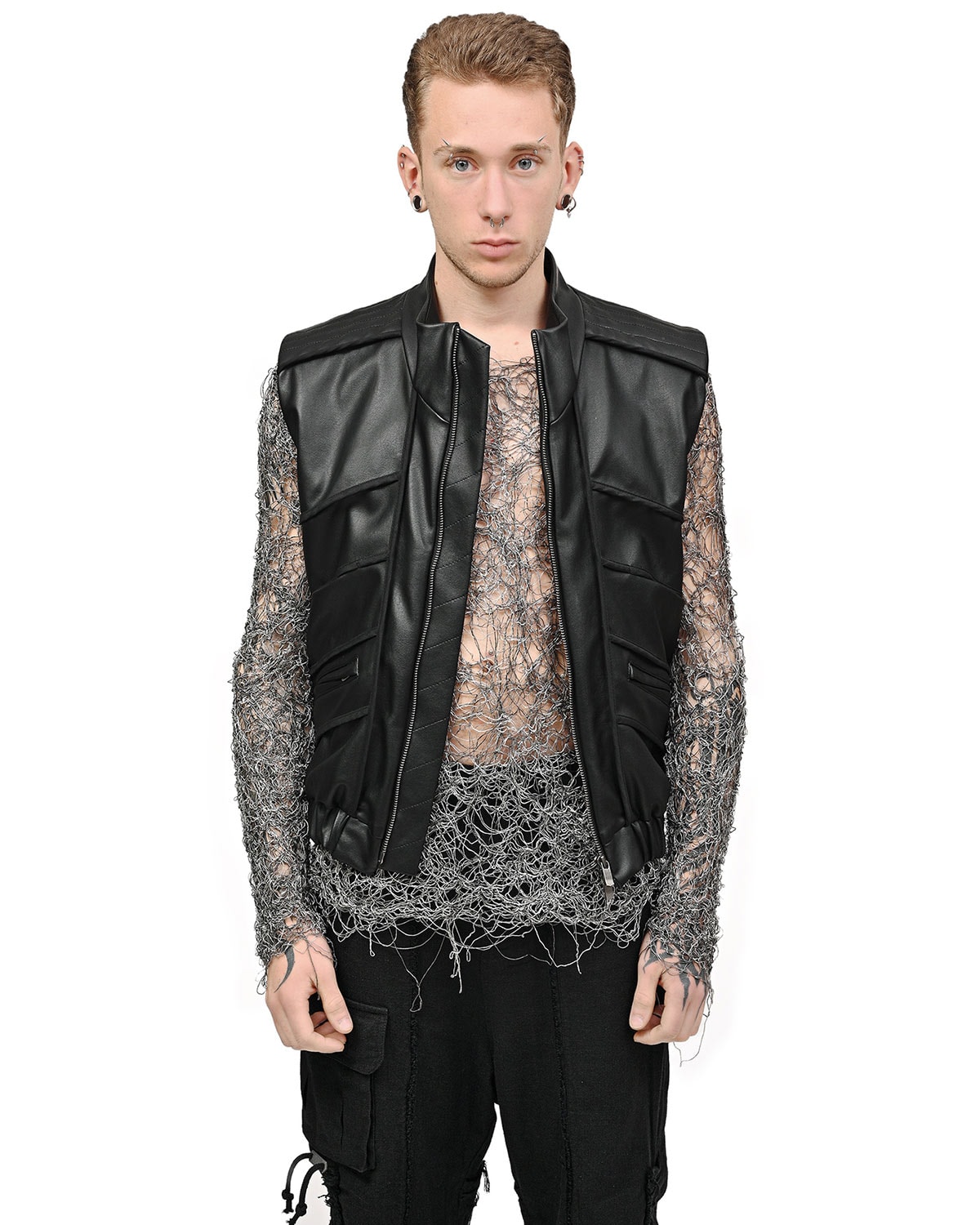 A cropped silhouette with a slim multi-segment diagonal cut design, directly provoked by the concept of fundamental particles in physics such as matter particles & force particles. Crafted with Minoar’s geometric philosophy in mind, this ‘Insolitum’ vest offers two signature diagonal cut welt pockets enhancing functionality. Featuring a raised collar and Minoar’s signature hexagonal steel buckle, completing the garment’s essential details.