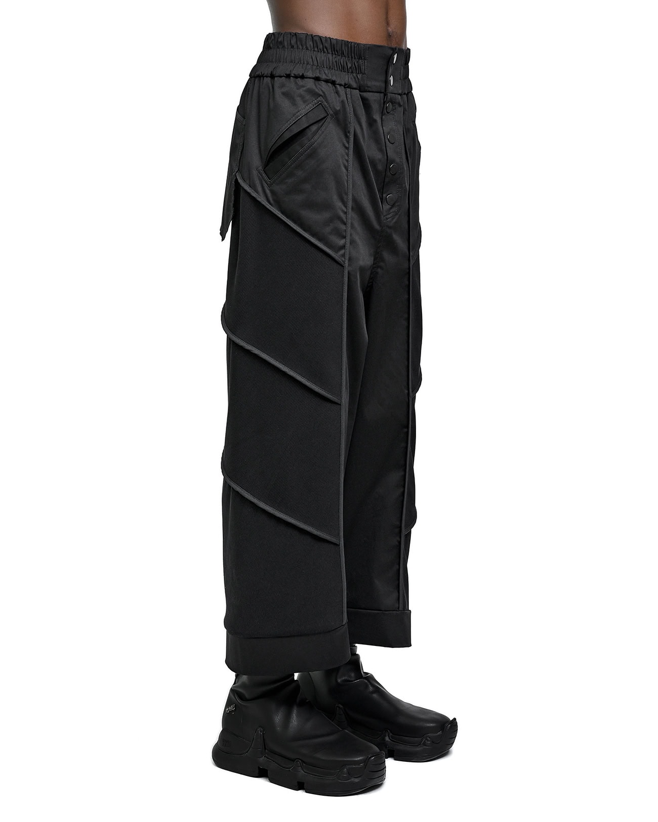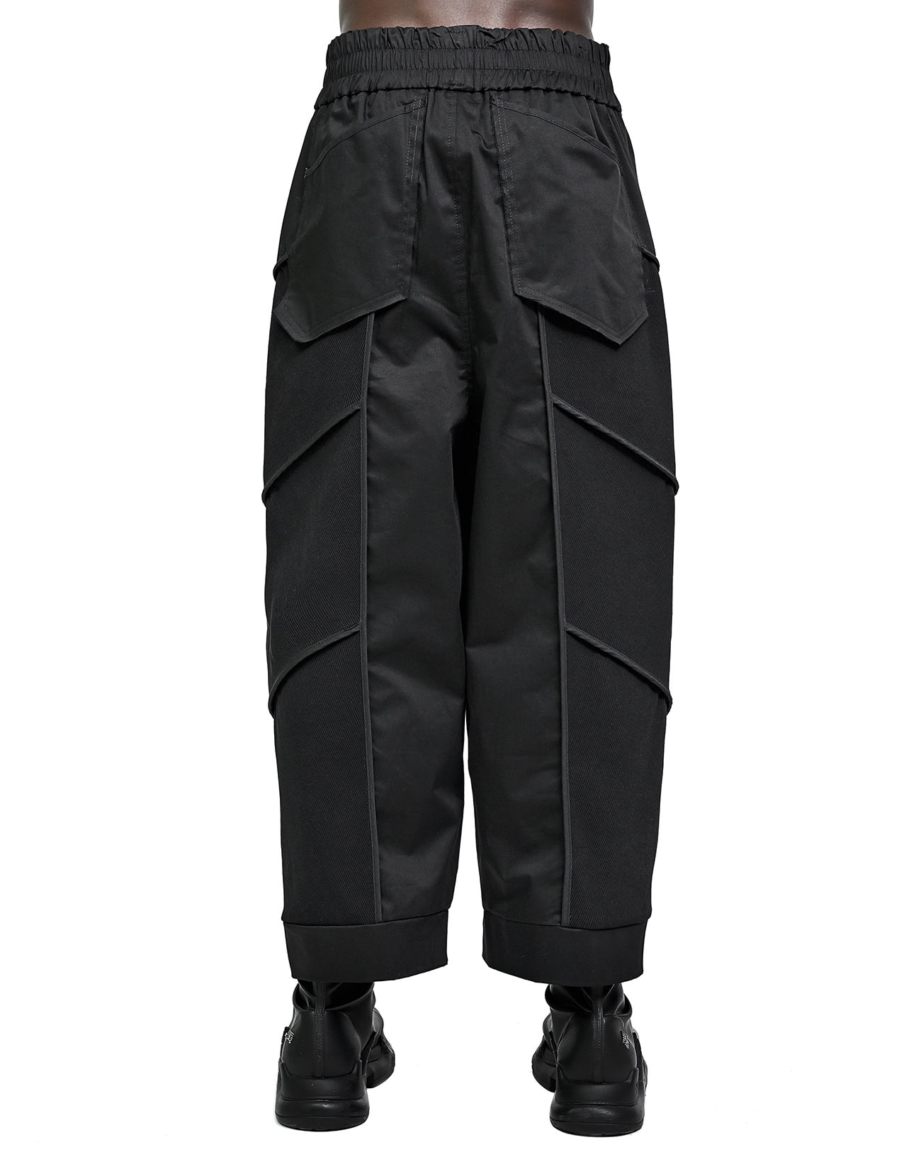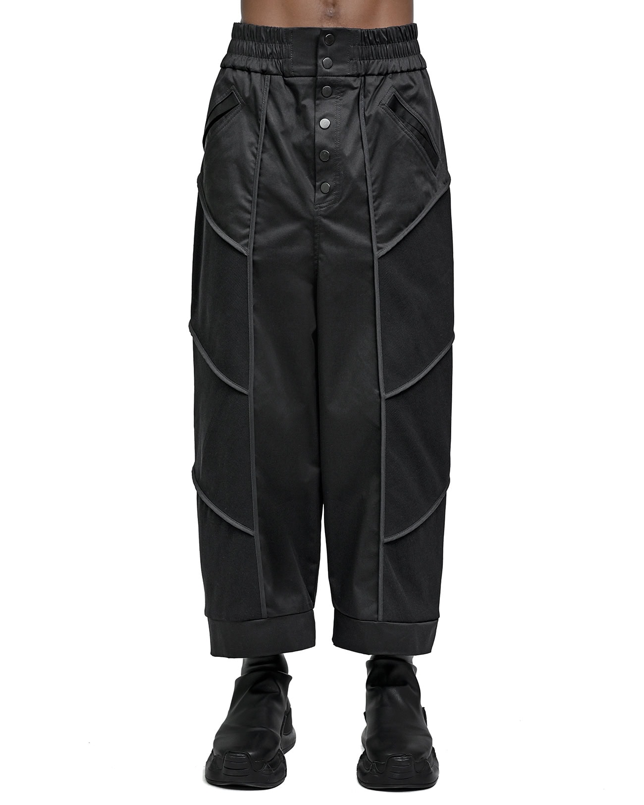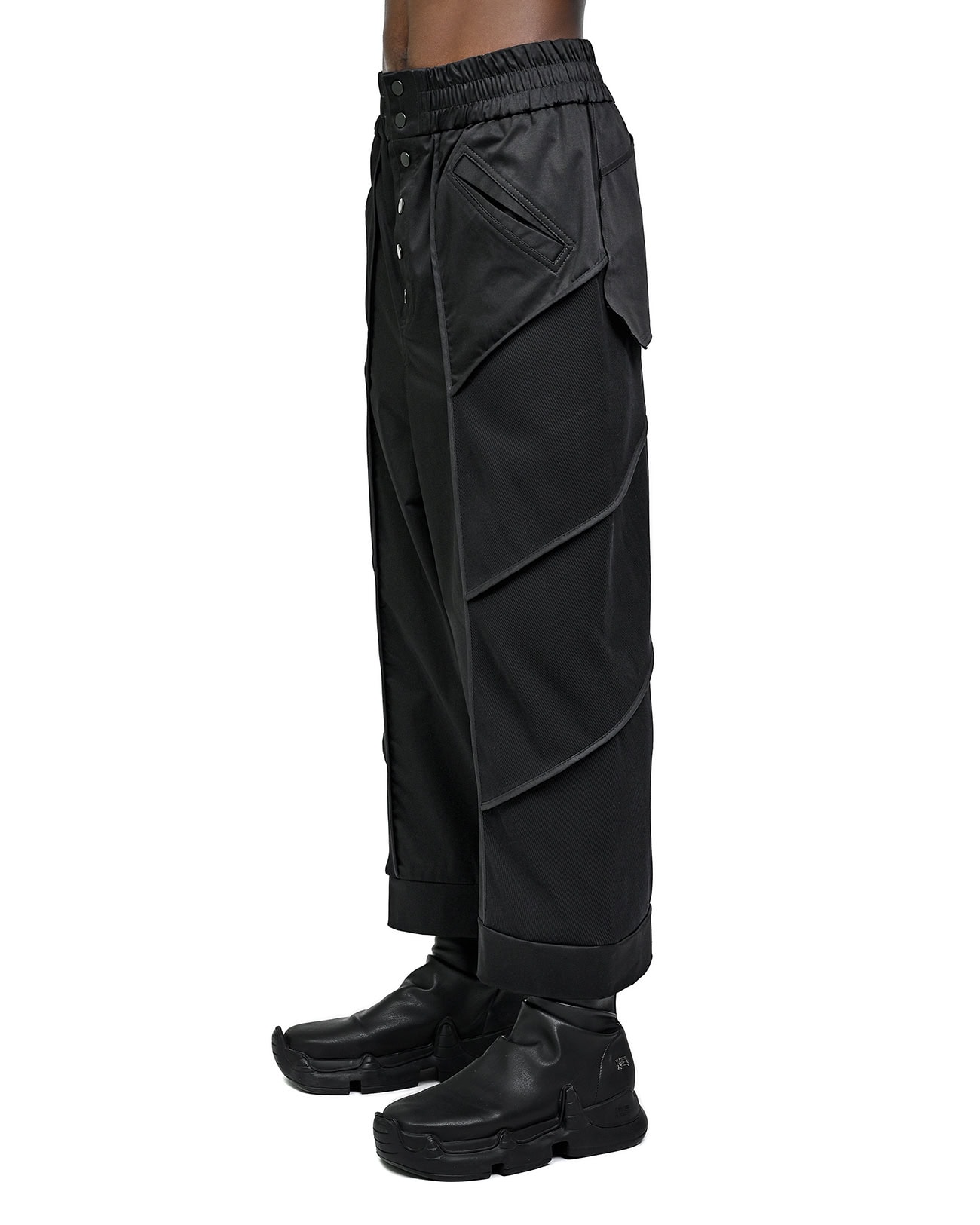 The Particle Wide Segment Pants feature a wide silhouette defined by a multi-segment ‘Particle’ angled cut in black rib knit and woven fabrics. Accentuated by raw edge details and an external edge bias binding finish, the design includes an elasticated waistband with a front YKK metal snap closure, two signature diagonal front pockets, and two rear hanging pockets.