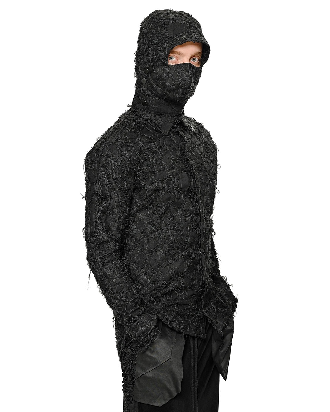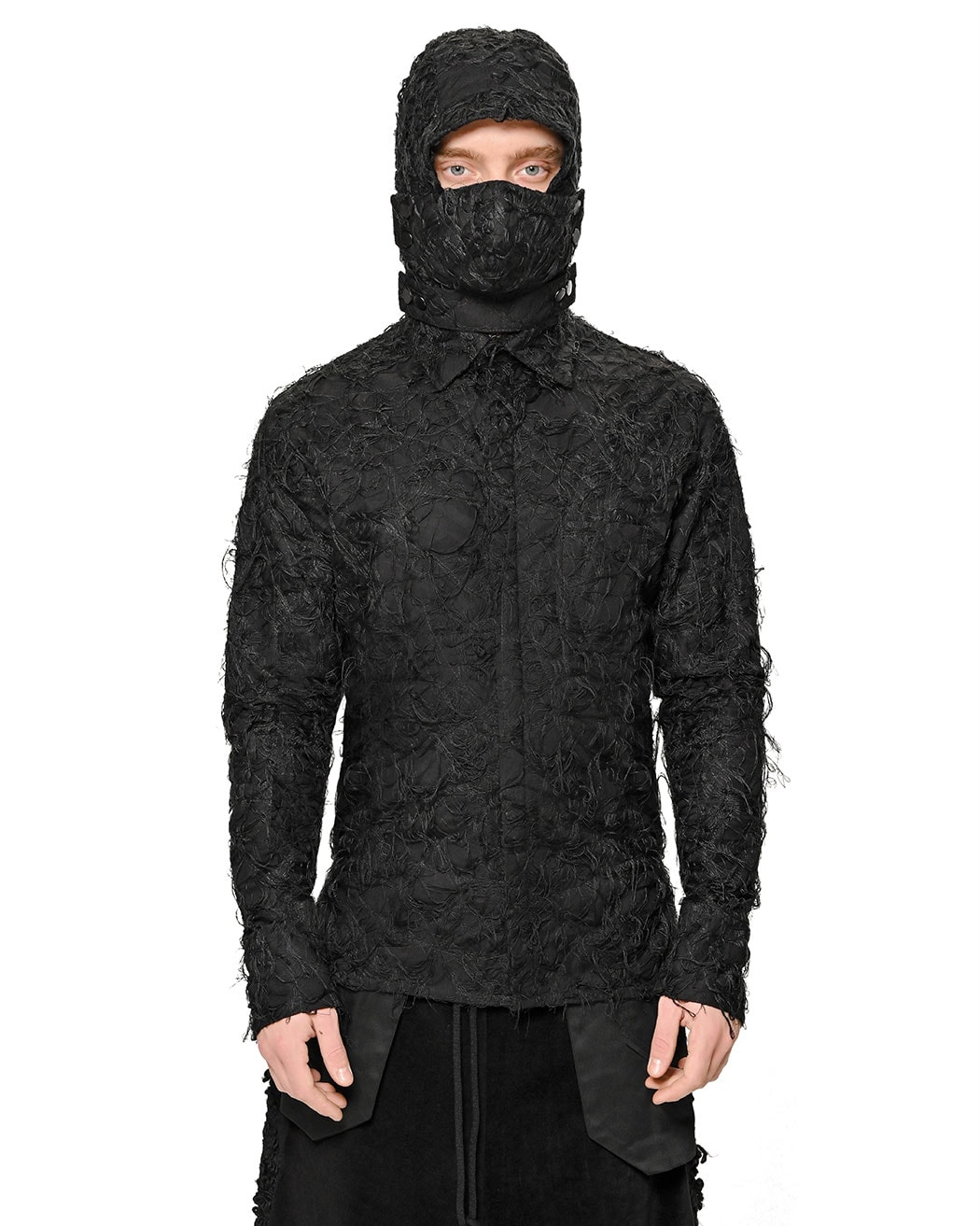 This all black ‘Shield’ Fiber Bond mask features chaotically spread yarns in pure black color. With a discrete dark tone, this headwear object is a preferable choice for any ‘Fiber Bond’ garment due to its subtle and toned design nature.