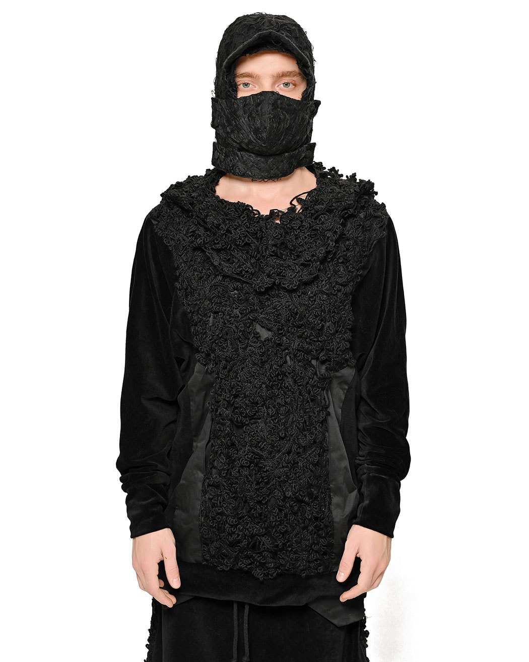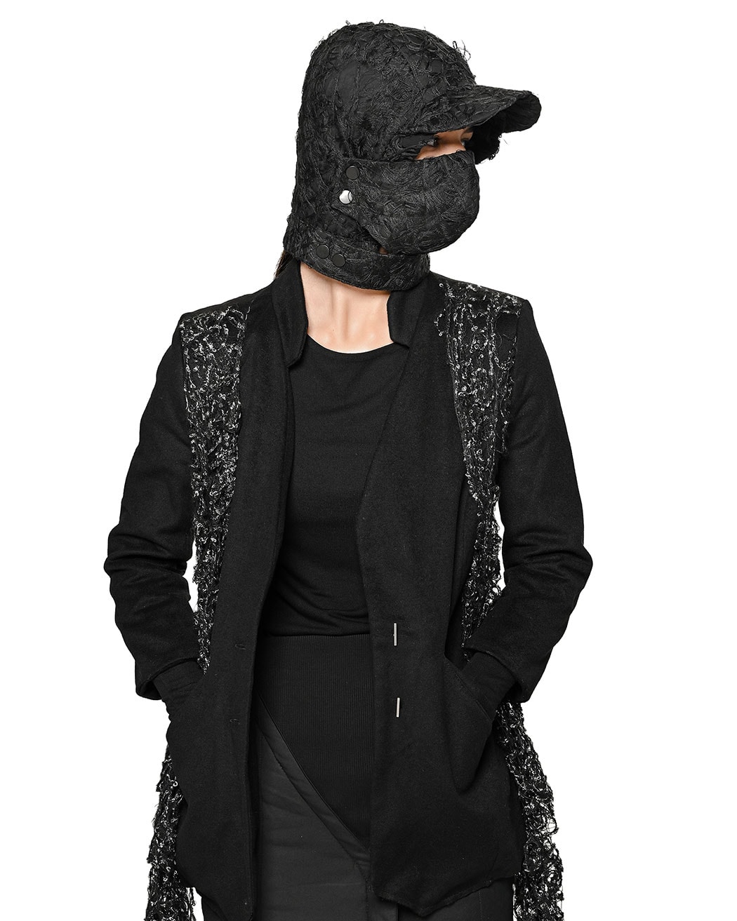 This all black ‘Shield’ Fiber Bond visor head mask features chaotically spread yarns in pure black color. With a discrete dark tone, this headwear object is a preferable choice for any ‘Fiber Bond’ garment due to its subtle and toned design nature.