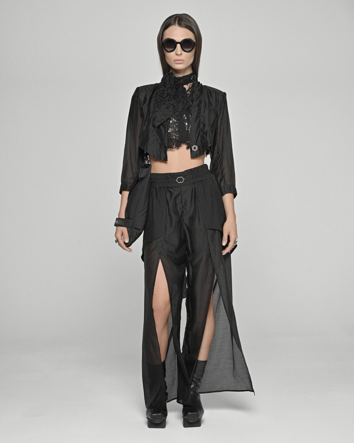Die Radiant Layered Hose übersetzt das Konzept der Strahlkraft in ein einzigartiges, mehrlagiges Design, bei dem zwei symmetrisch abfallende Lagen eine fließende, überlappende Struktur schaffen.