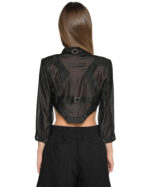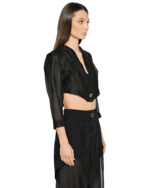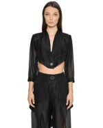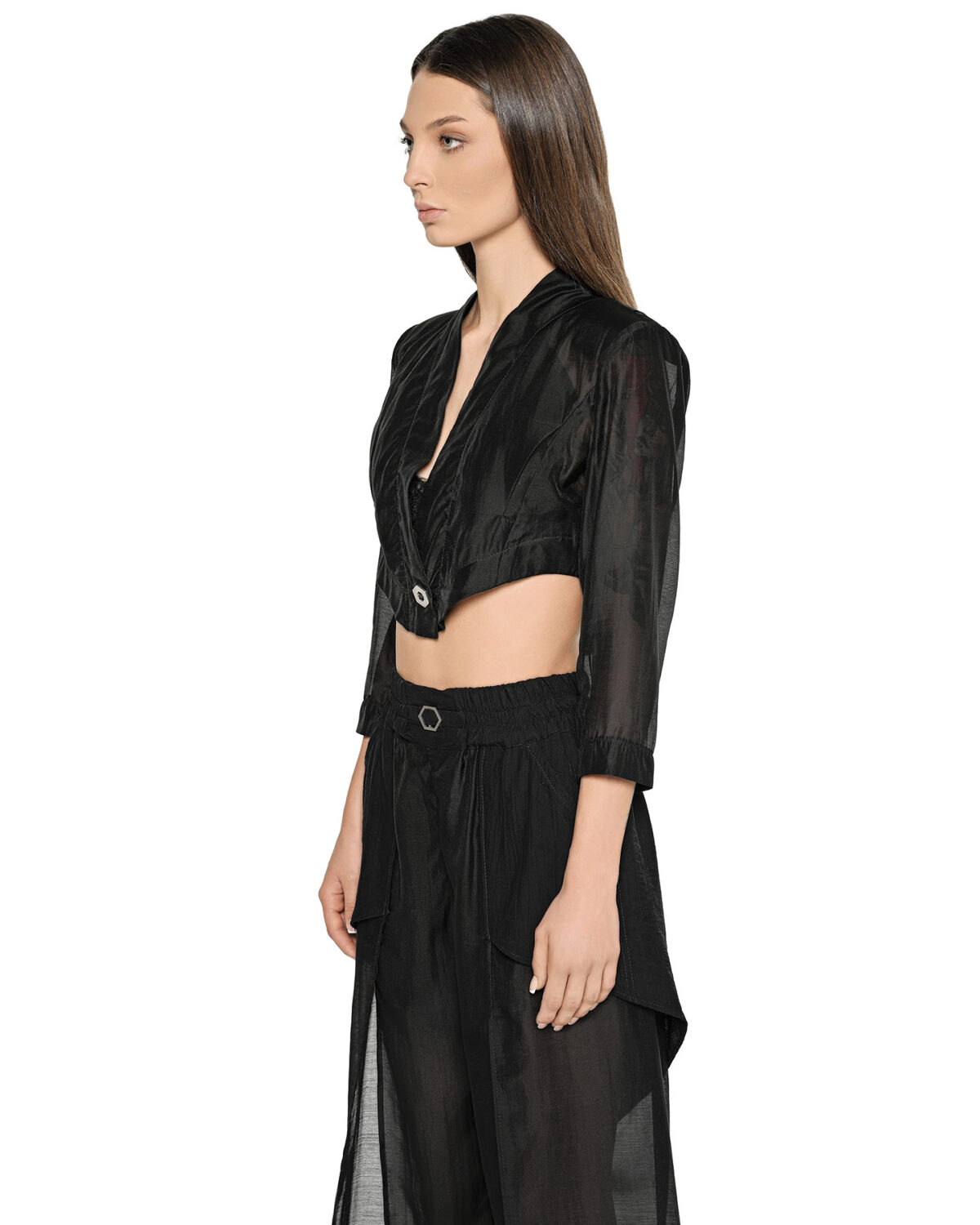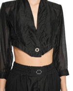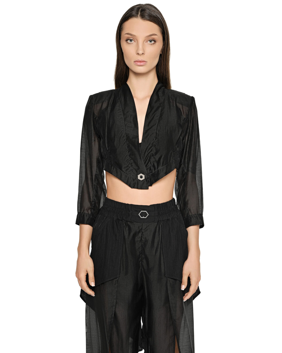 The Radiant Semi-Sheer Blazer achieves its relaxed yet architectural form through a cropped, geometric cut in lightweight, semi-sheer satin, structured with padded shoulders and secured rear paneling.