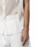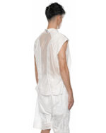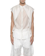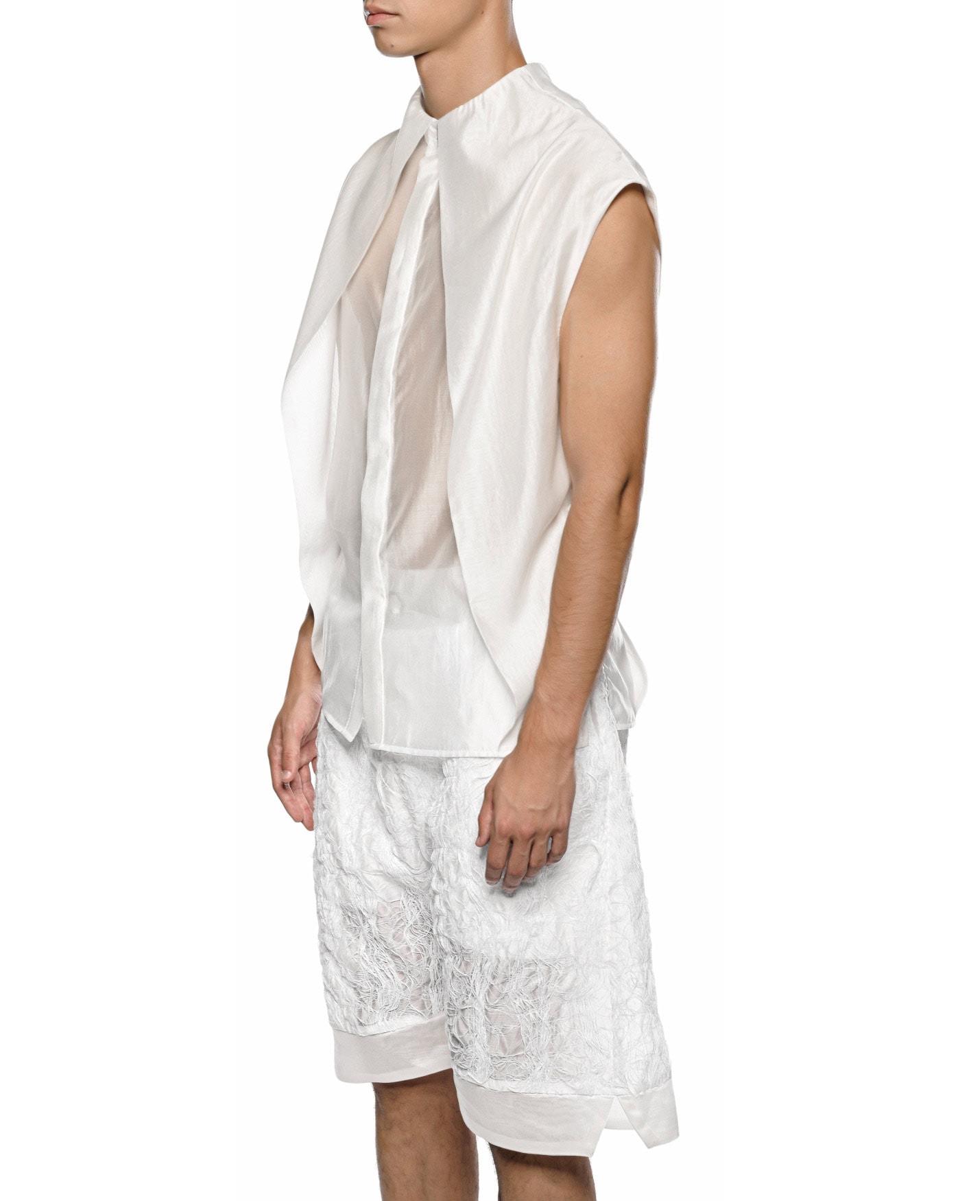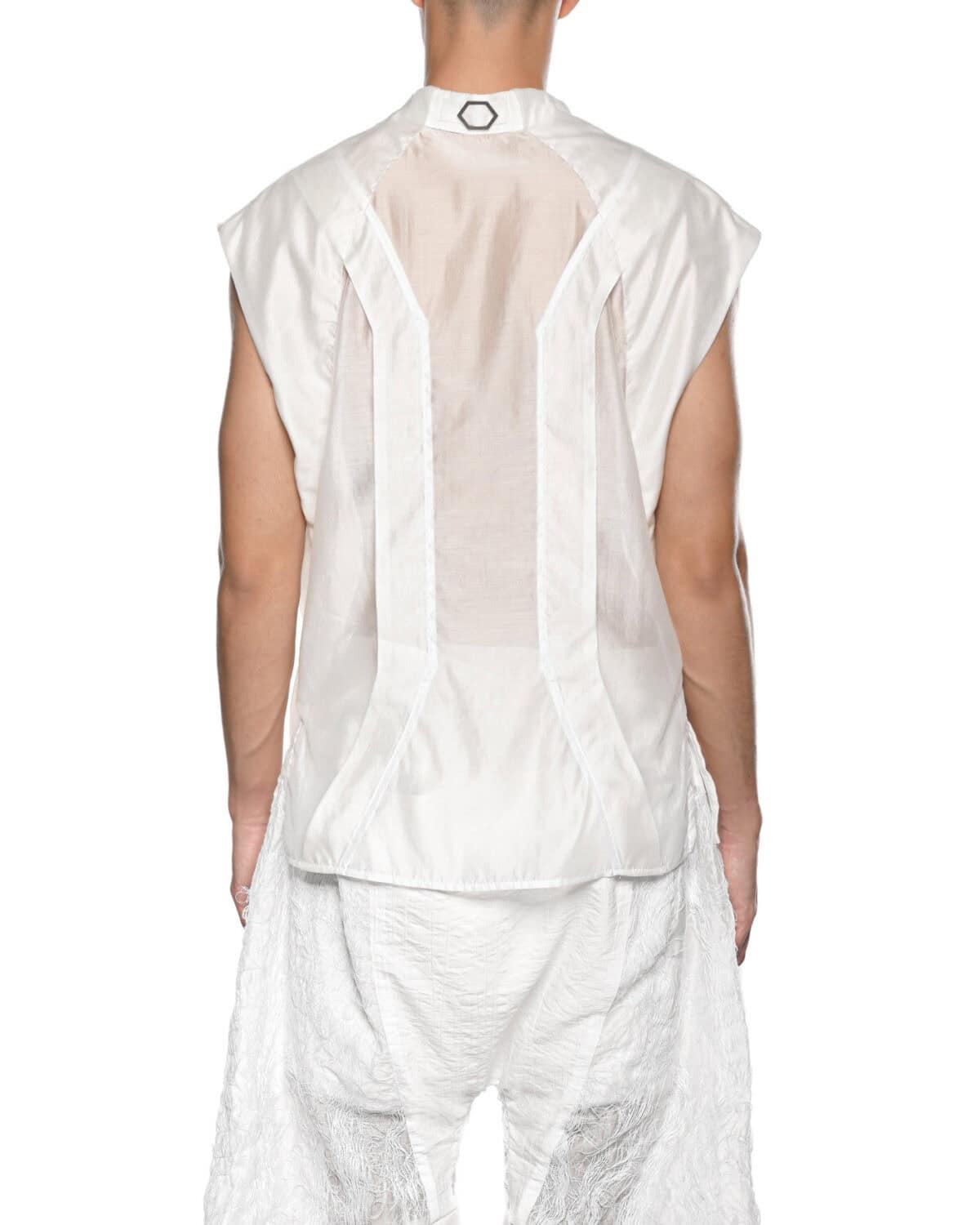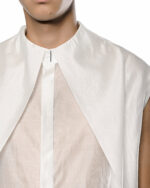 This sleeveless shirt captures a sense of Radiant energy through its draped, layered design and semi-sheer, satin-finish fabric. The interplay of light across the bone-white layers creates a subtle glow, giving the loose silhouette an ethereal and sophisticated presence.