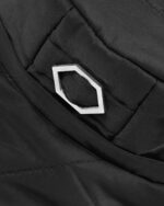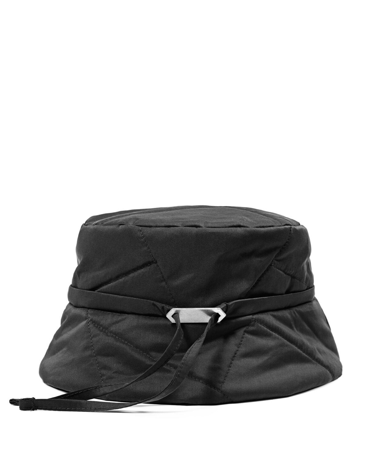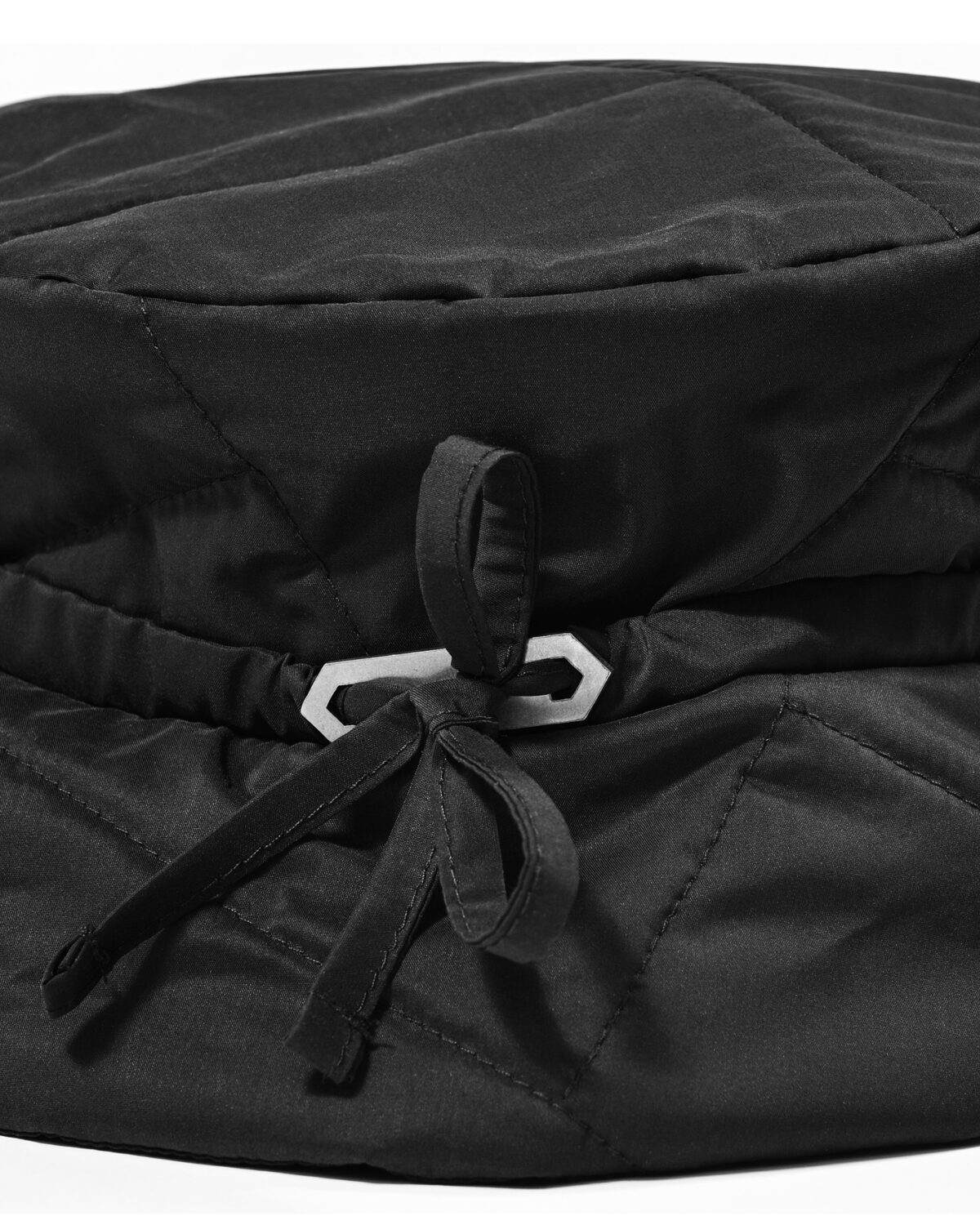 The Inox Segment Bucket Hat’s signature linear quilting over inner wadding creates a structured silhouette in black satin defined by a narrow, downward-sloping brim.