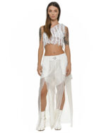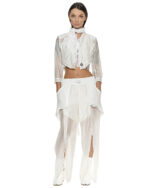The Single Shoulder Filamentous Top is entirely handcrafted utilizing the Signature ‘Fiber Bond’ technique, forming a delicate, transparent yarn pattern over a slim, asymmetrical silhouette.