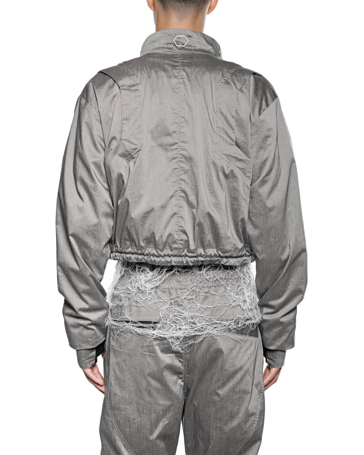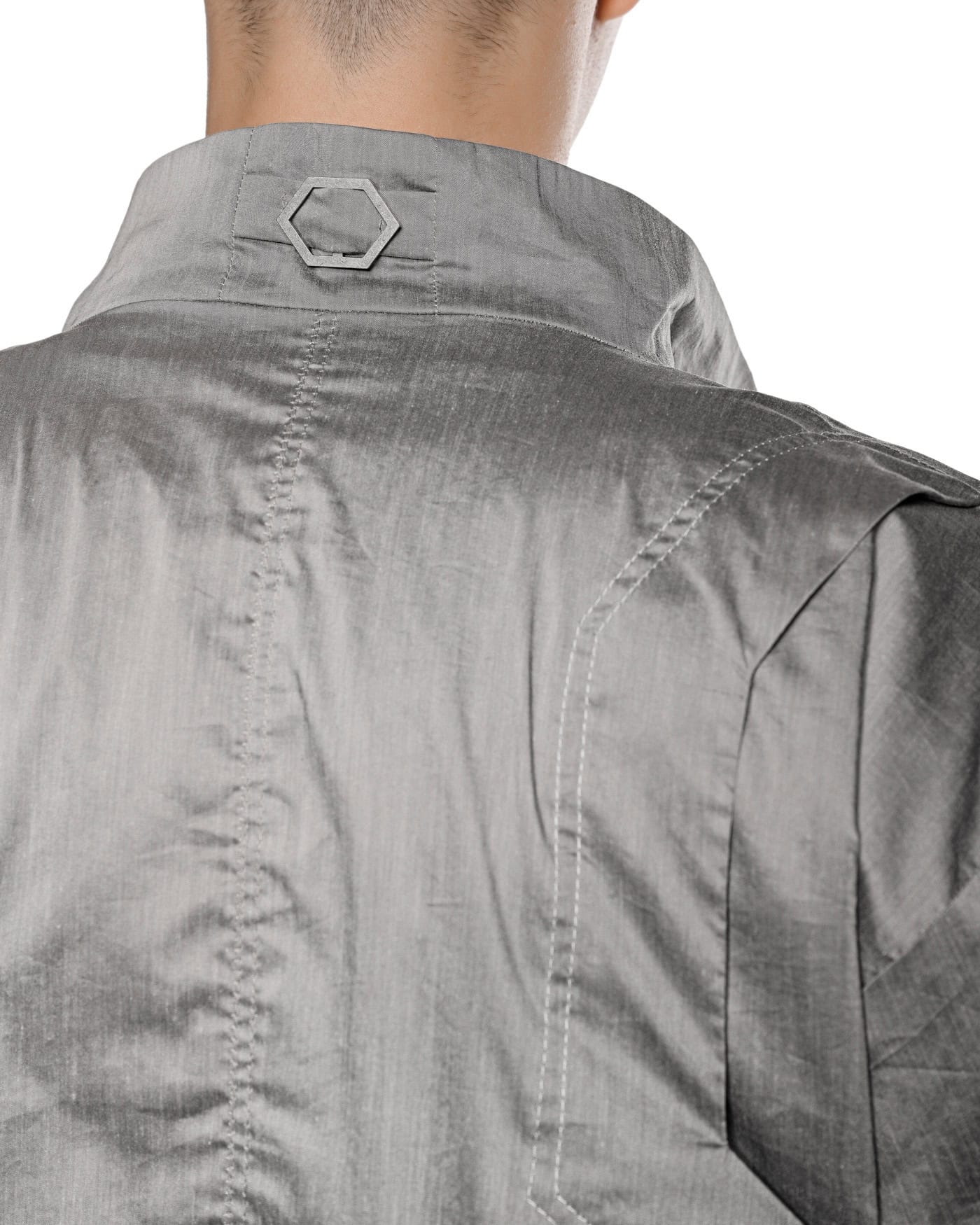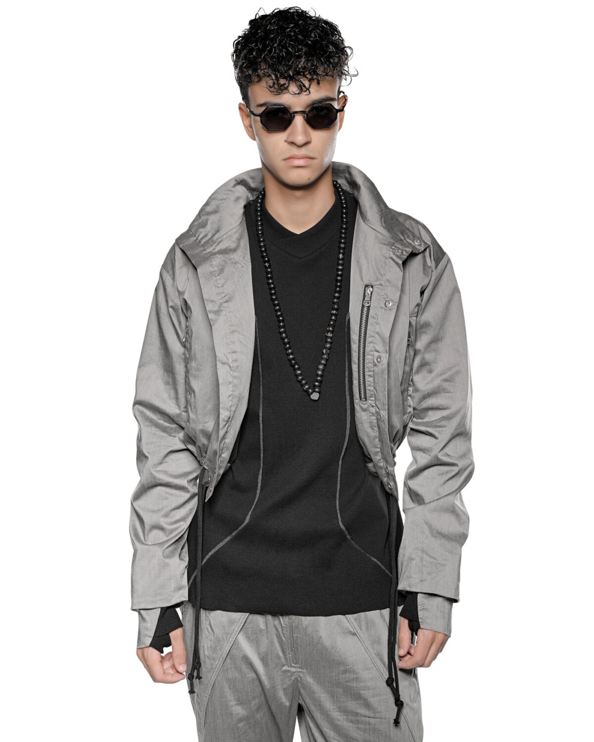 This tech jacket translates the concept of Stellar systems into a highly functional design, where a multitude of distinctive details work in unison. Its relaxed, cropped silhouette is engineered for comfort with a full cotton lining, while the technical paneling and signature hardware give the piece a complex, utilitarian character.