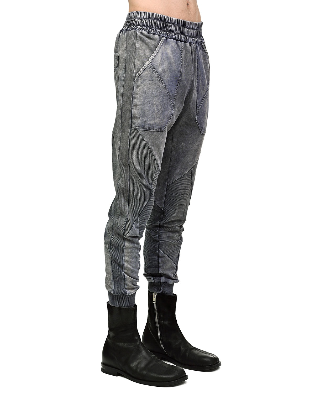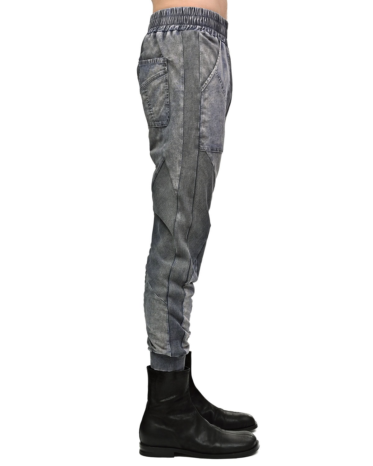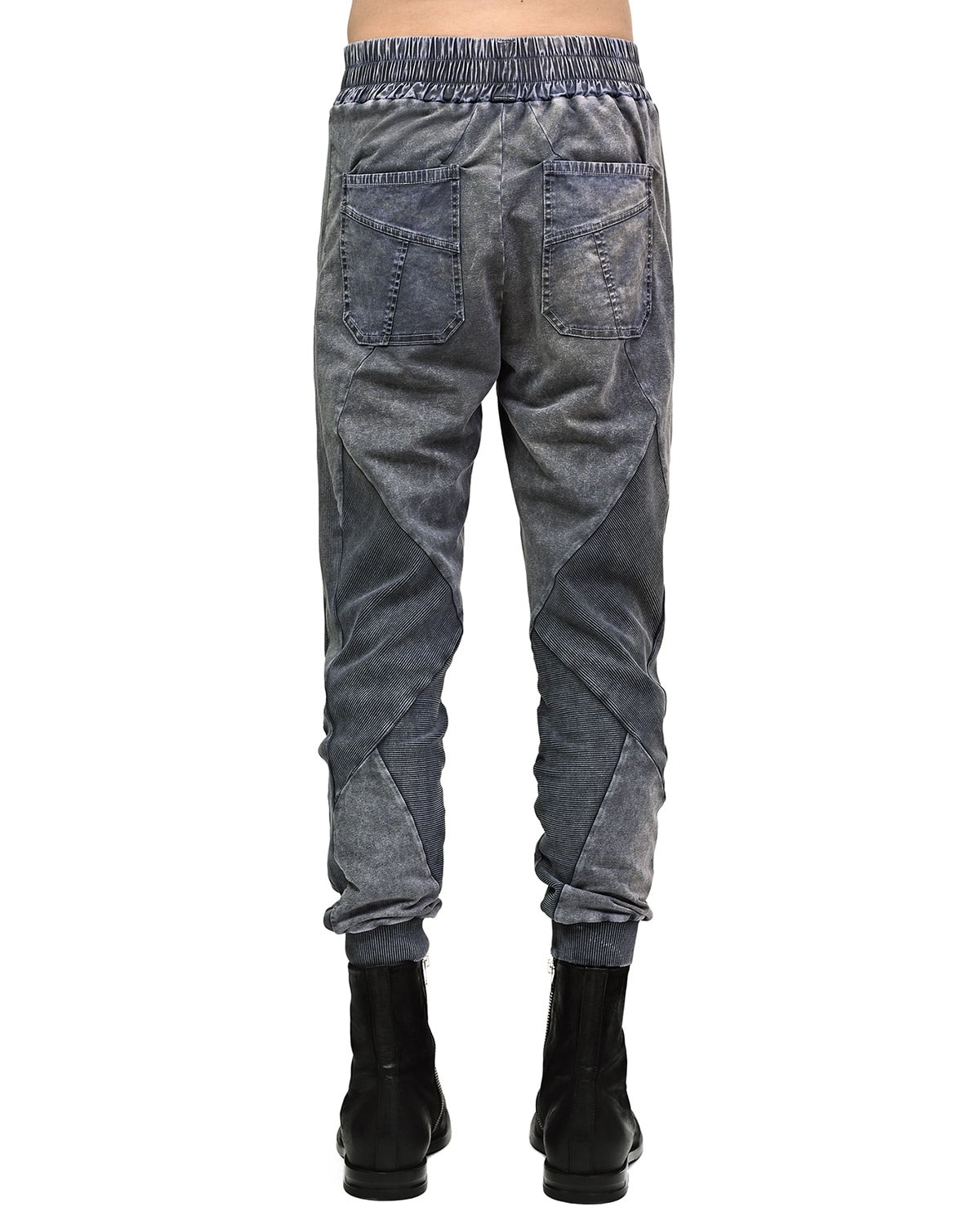 These ‘Insolitum’ Stone Texture track pants are crafted in soft, elasticated ribbed knit cotton in unique, highly textured and nuanced object-dye technique unveiling complex shades of grey, blue, green & black. These track pants are the continuance version of the signature ‘Refract’ multi-segment cut construction.