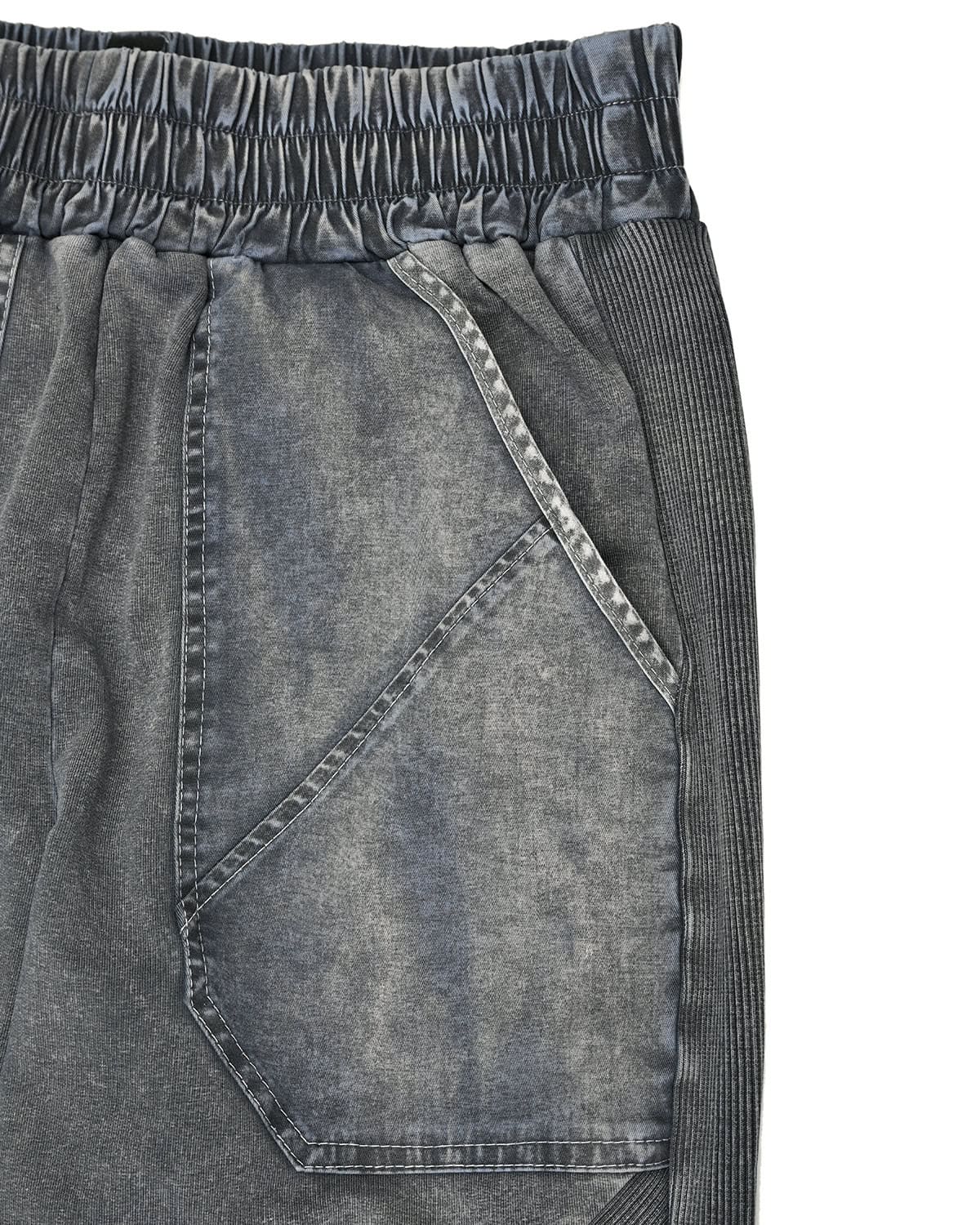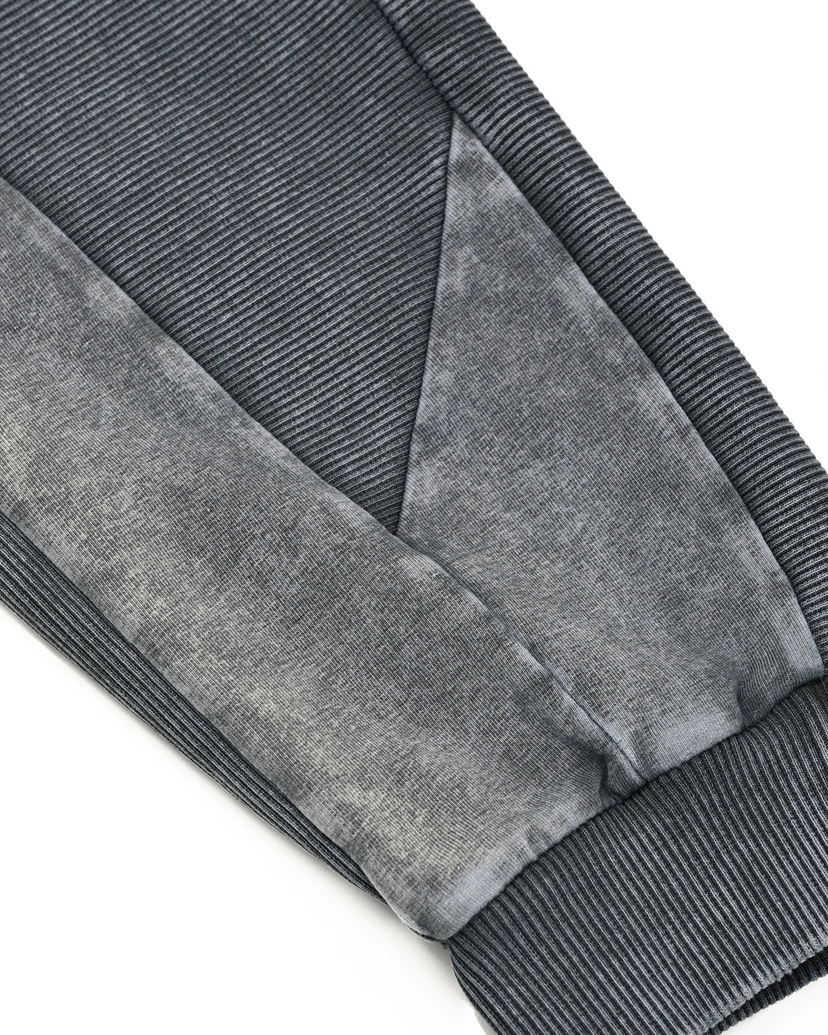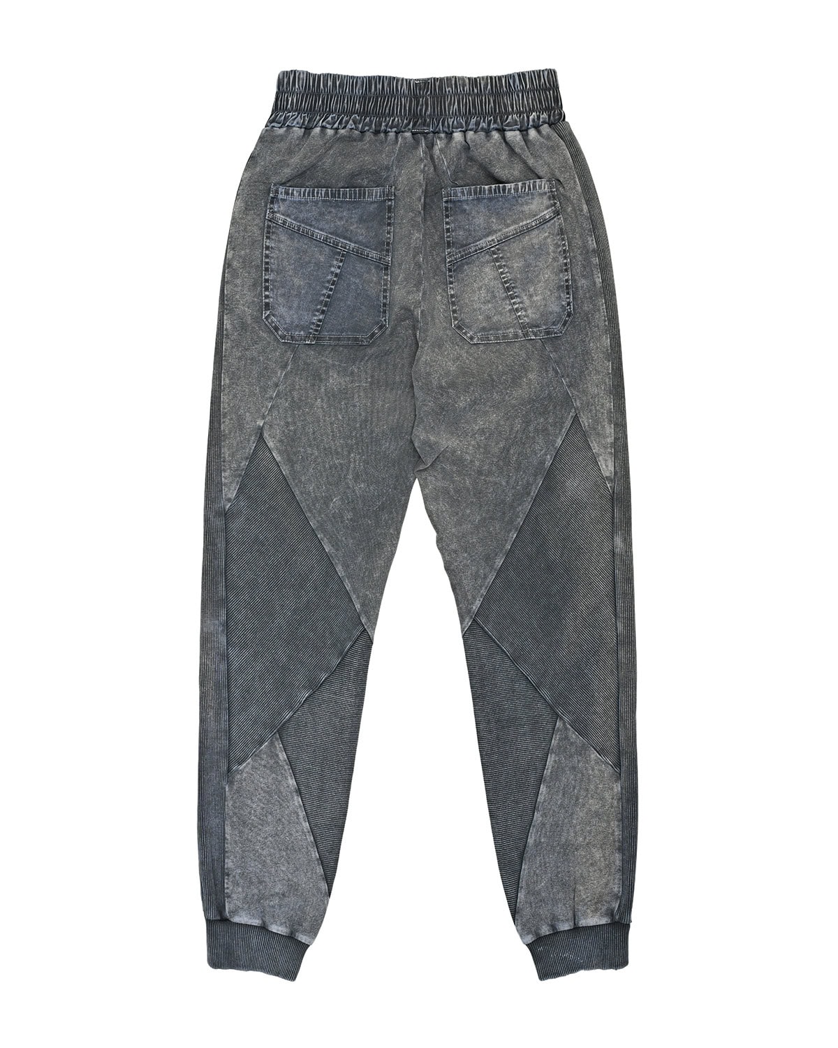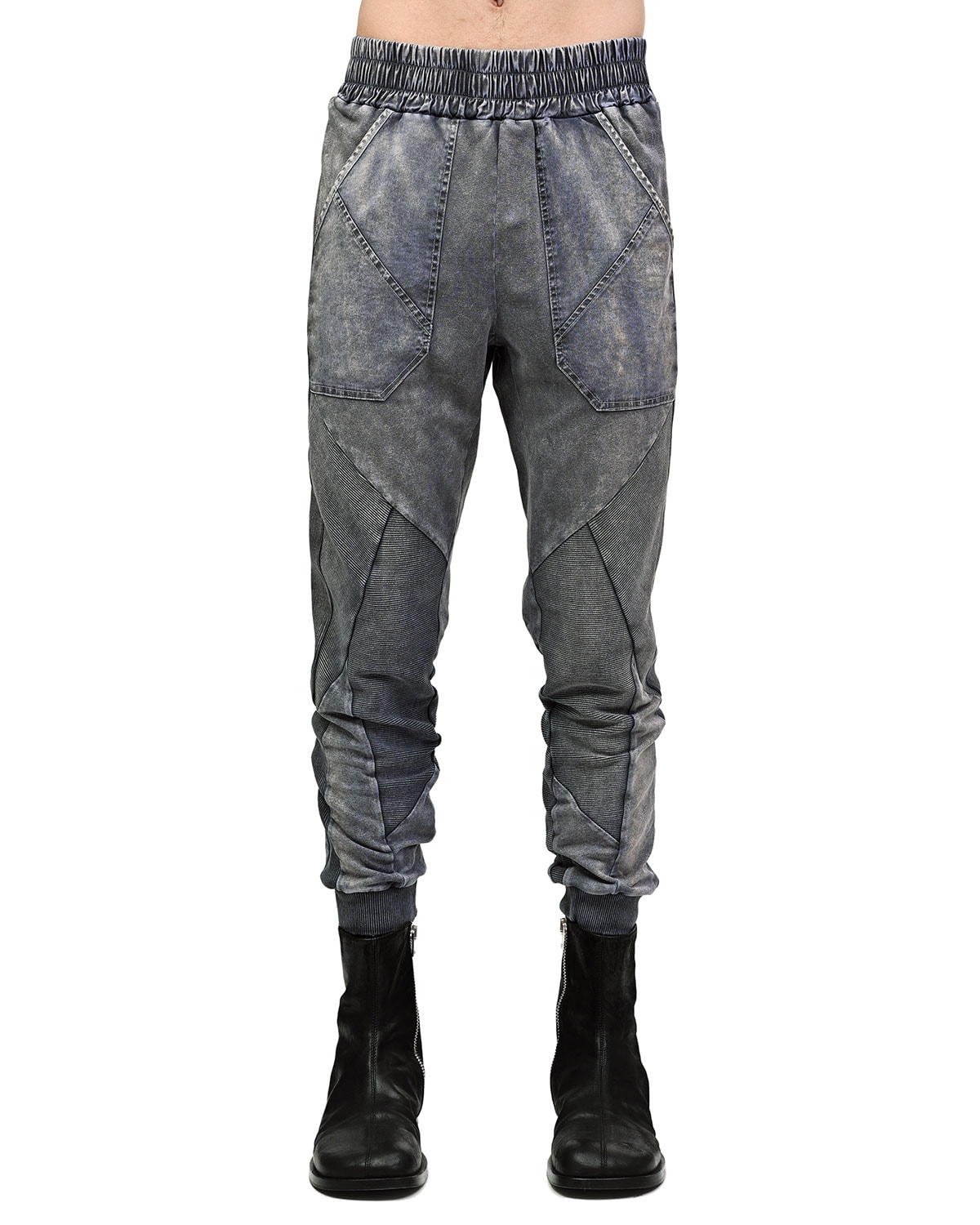These ‘Insolitum’ Stone Texture track pants are crafted in soft, elasticated ribbed knit cotton in unique, highly textured and nuanced object-dye technique unveiling complex shades of grey, blue, green & black. These track pants are the continuance version of the signature ‘Refract’ multi-segment cut construction.