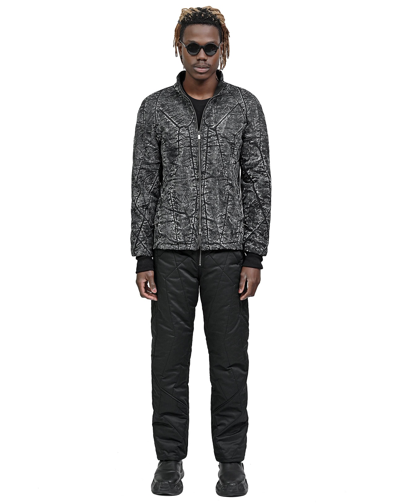 Encouraged by the faster than light hypothetical particle in quantum field theory – the Tachyon, this garment shapes a direct provocation through linear quilt stitching in a geometrical pattern. Elevated by Minoar’s signature steel hexagon buckle at rear of high-neck collar, it offers full insulation, optimal warmth and comfort of wear.