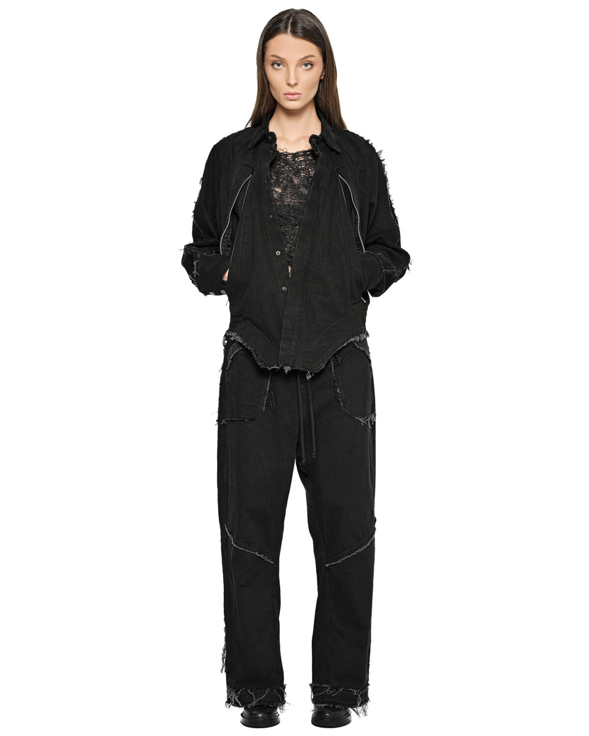 – Raw frayed edges throughout