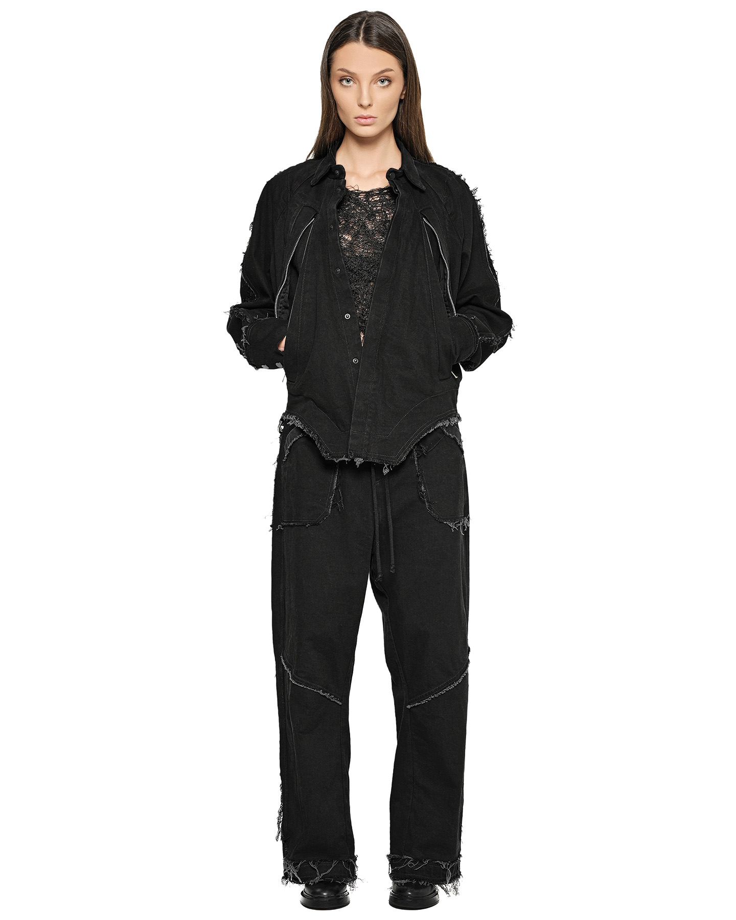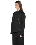 The Washed Gravity Deconstruct Jacket derives its distinct character from a washed fabric treatment and exaggerated diagonal YKK zip pockets defining its architecture.