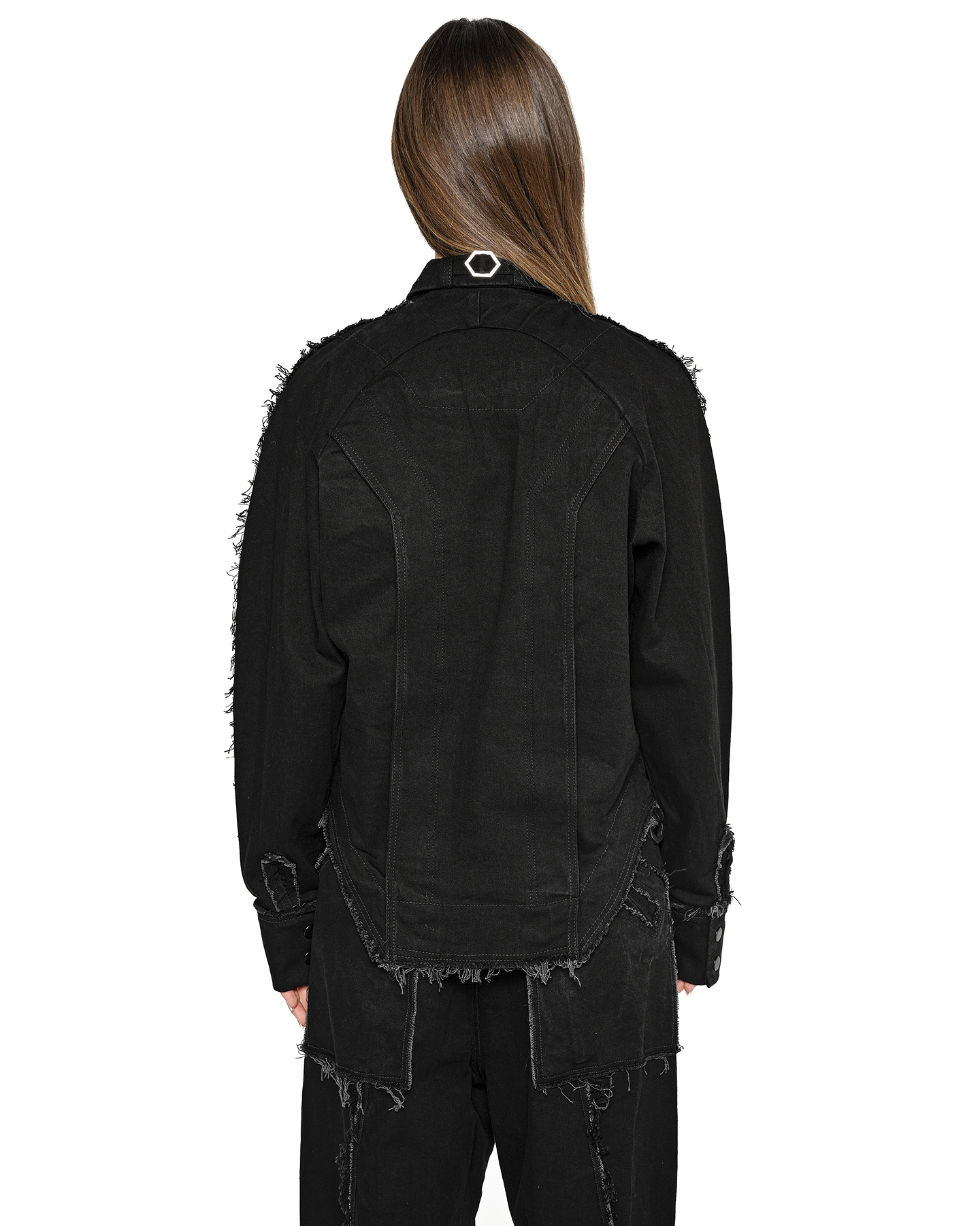A hexagon buckle at the rear collar and a D-ring at the deconstructed hem anchor the design, providing key focal points to the functional precision.