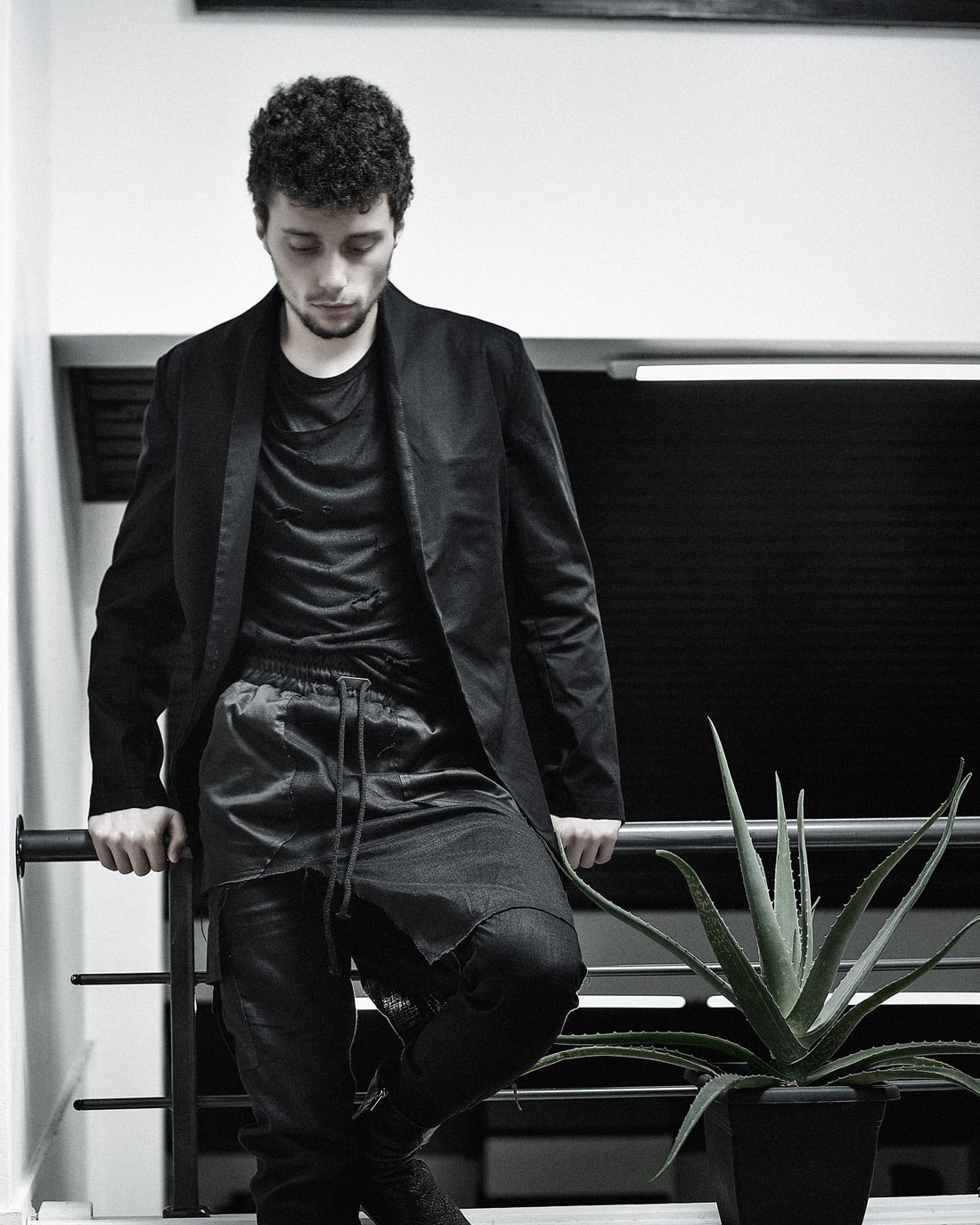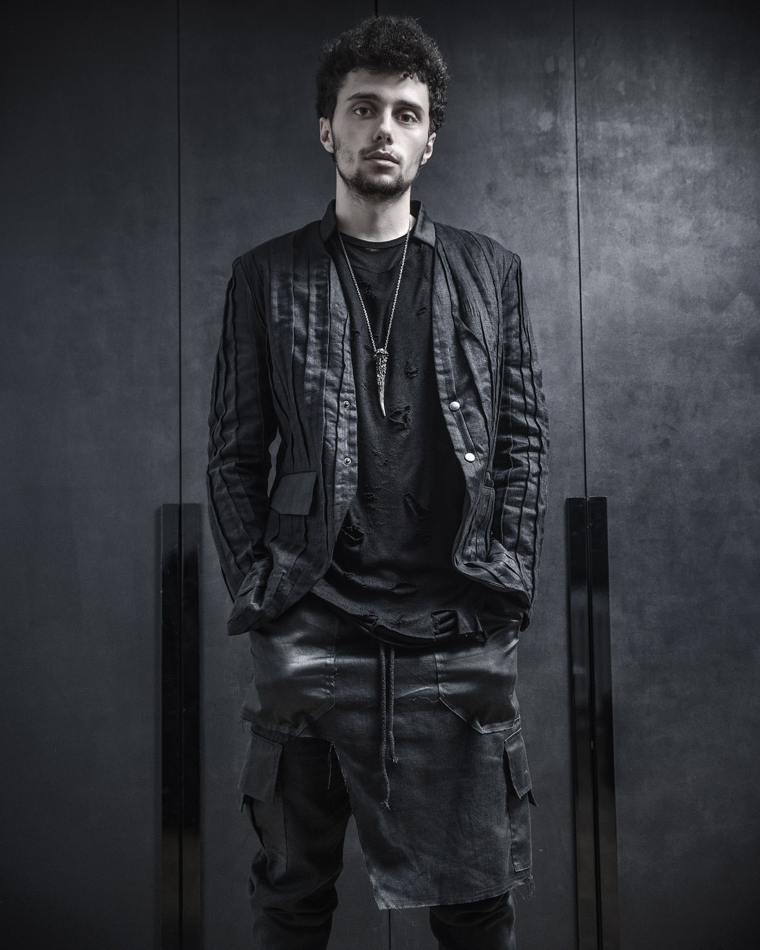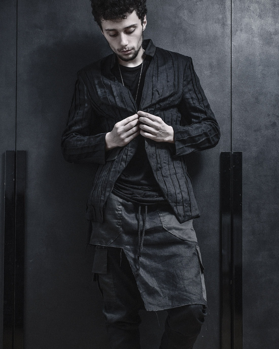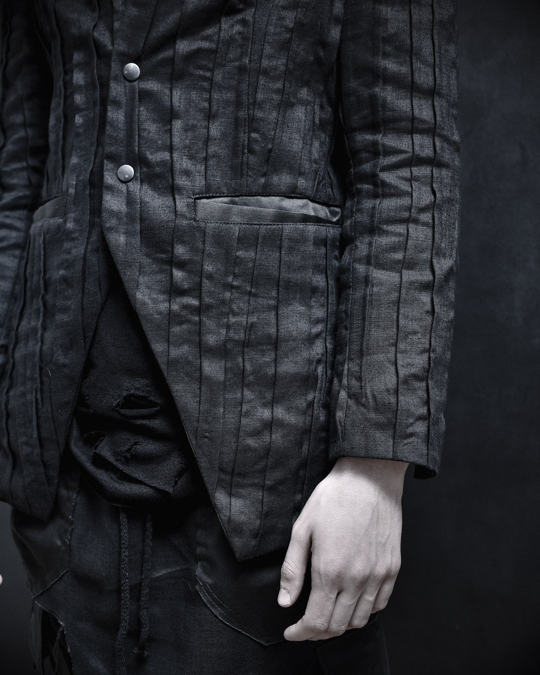 Layered Destroyed T-Shirt und das Quark Leinen Cargo Lagenrock Hose. Beide haben eine mehrschichtige dekonstruktive Silhouette mit rohen Kanten.