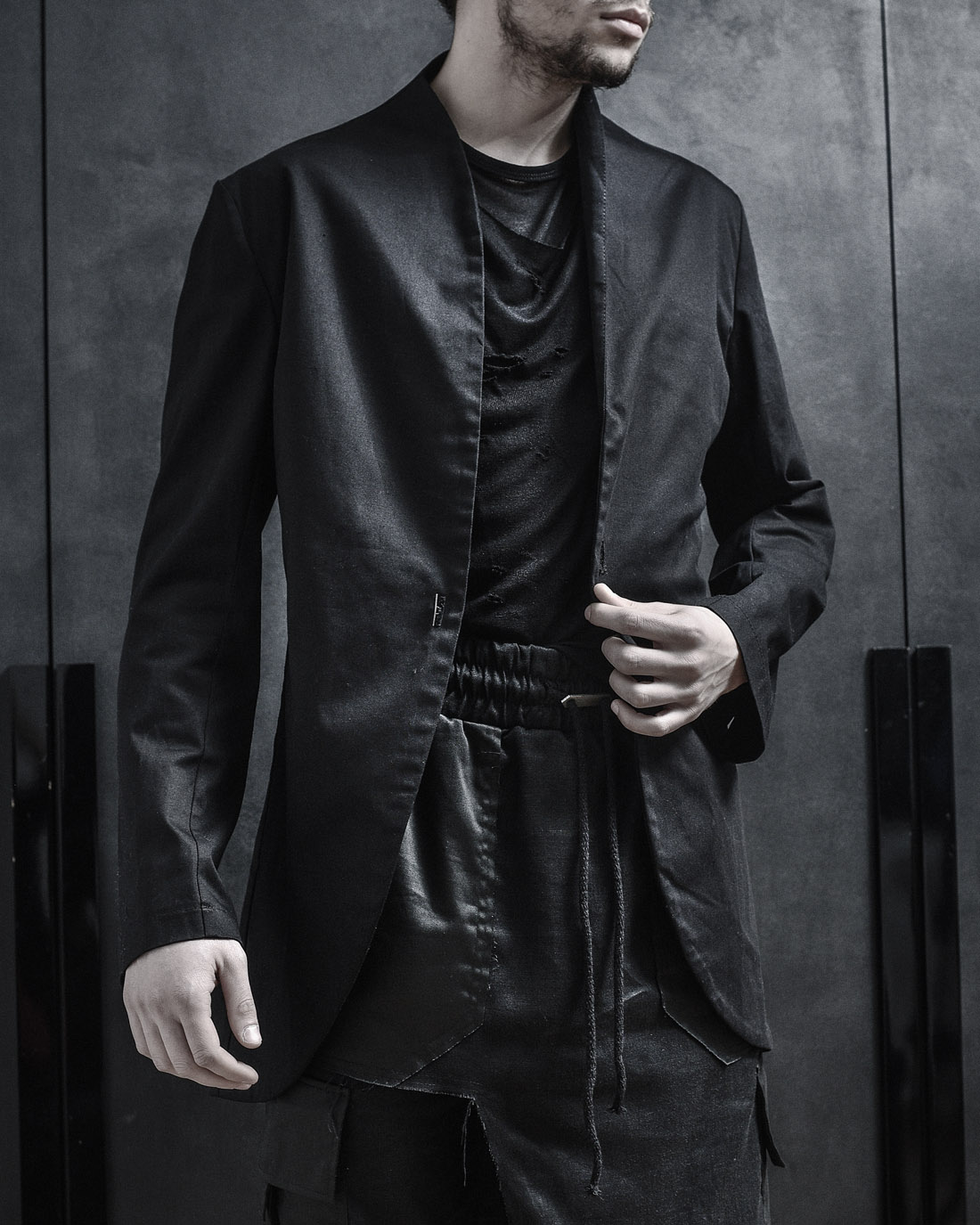 Der nächste Artikel aus der Auswahl ist der UNSULLIED SCHWARZER BLAZER. Vergrößerter Blazer aus feinem Baumwollstoff in authentischem Schwarzton, mit Ausnahme einer handgefertigten silber-oxidierten schwarzen Knopfverbindung.