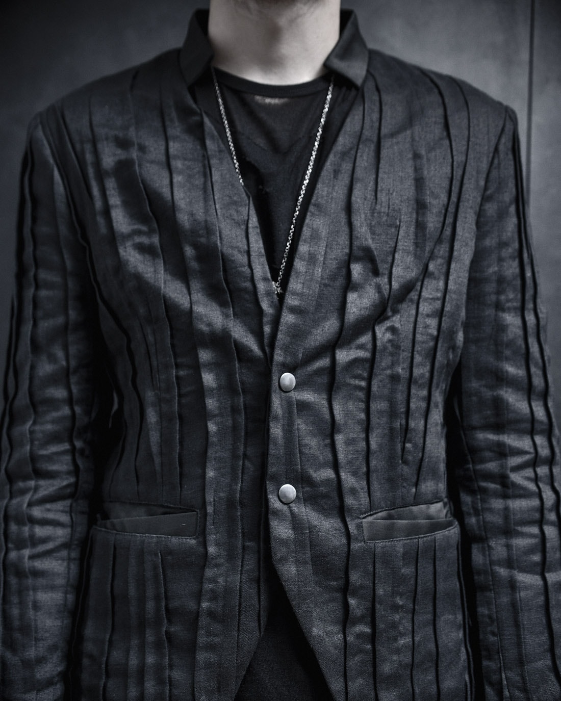 Einführung in die Linear Blazerjacke mit Crushed-Technik. Das in der charakteristischen Crushed-Technik gefertigte Modell verfügt über eine dezente Schulterpolsterung und geschlitzte Manschetten.
