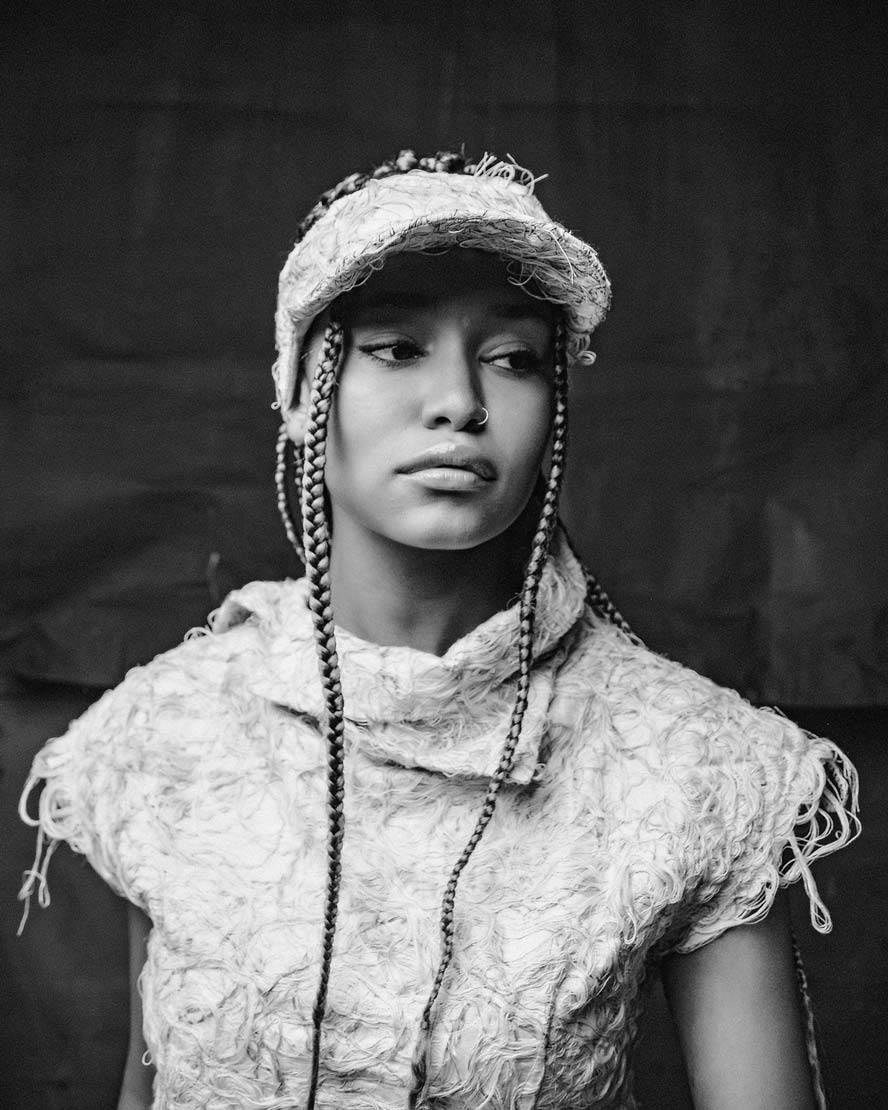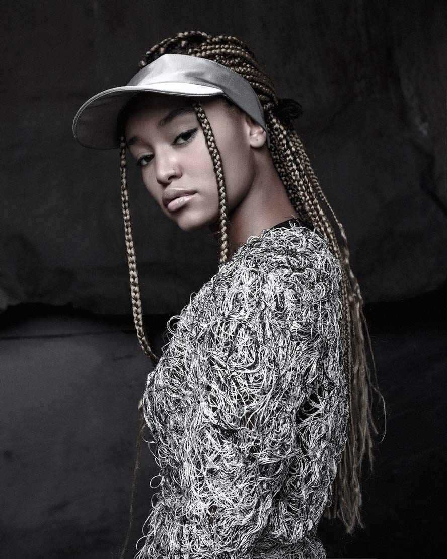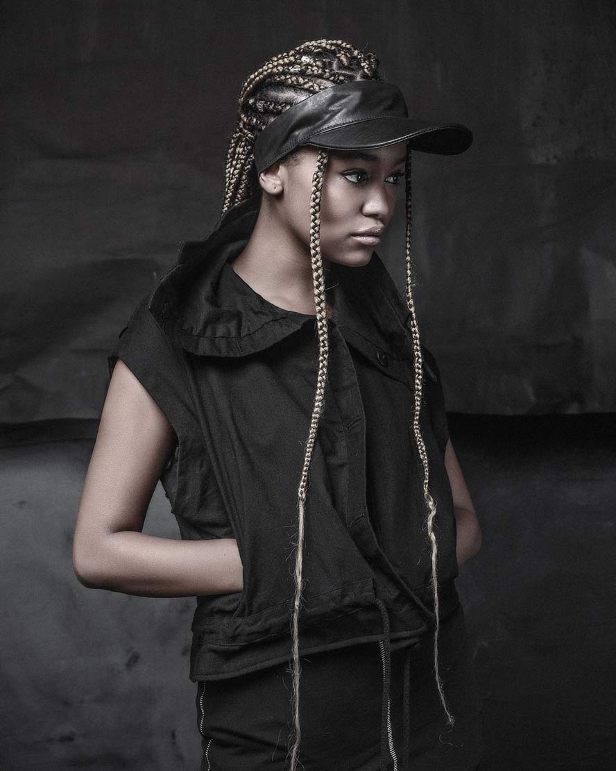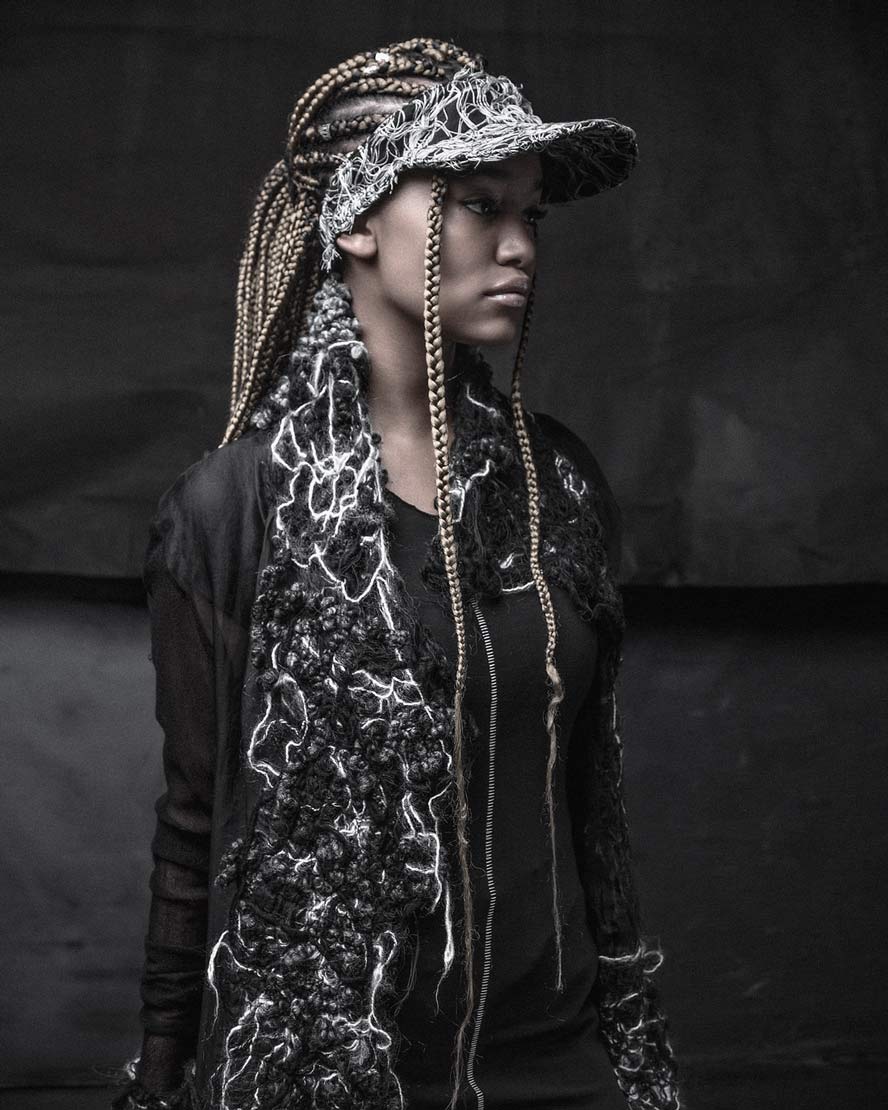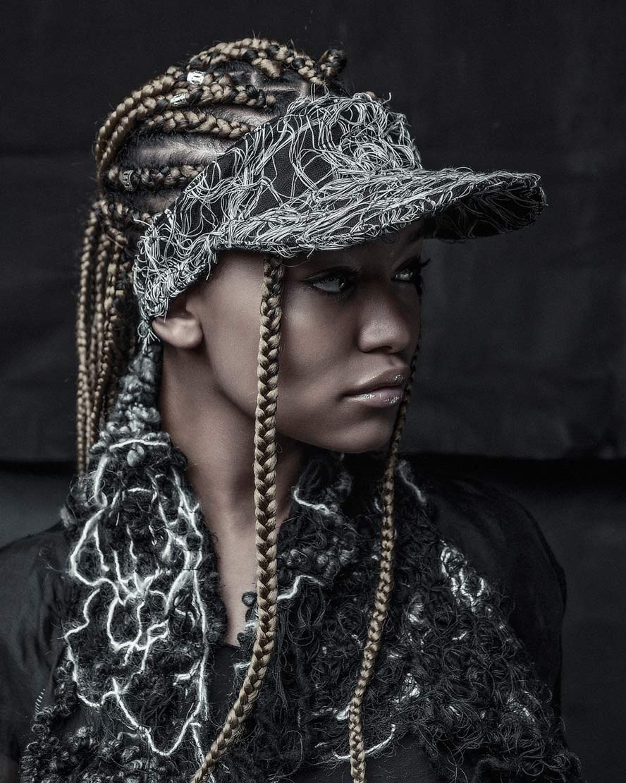 The womenswear collection entitled ‘Structure’ comes with a variety of 5 different unisex open top visor hats. A colorless palette unveils the signature technique ‘Fiber Bonding’ in nuanced white, black & white & black fibers, alongside the two silvery grey and black soft leather visor hats.