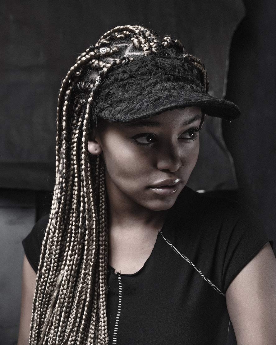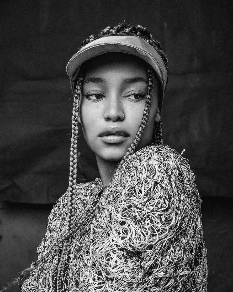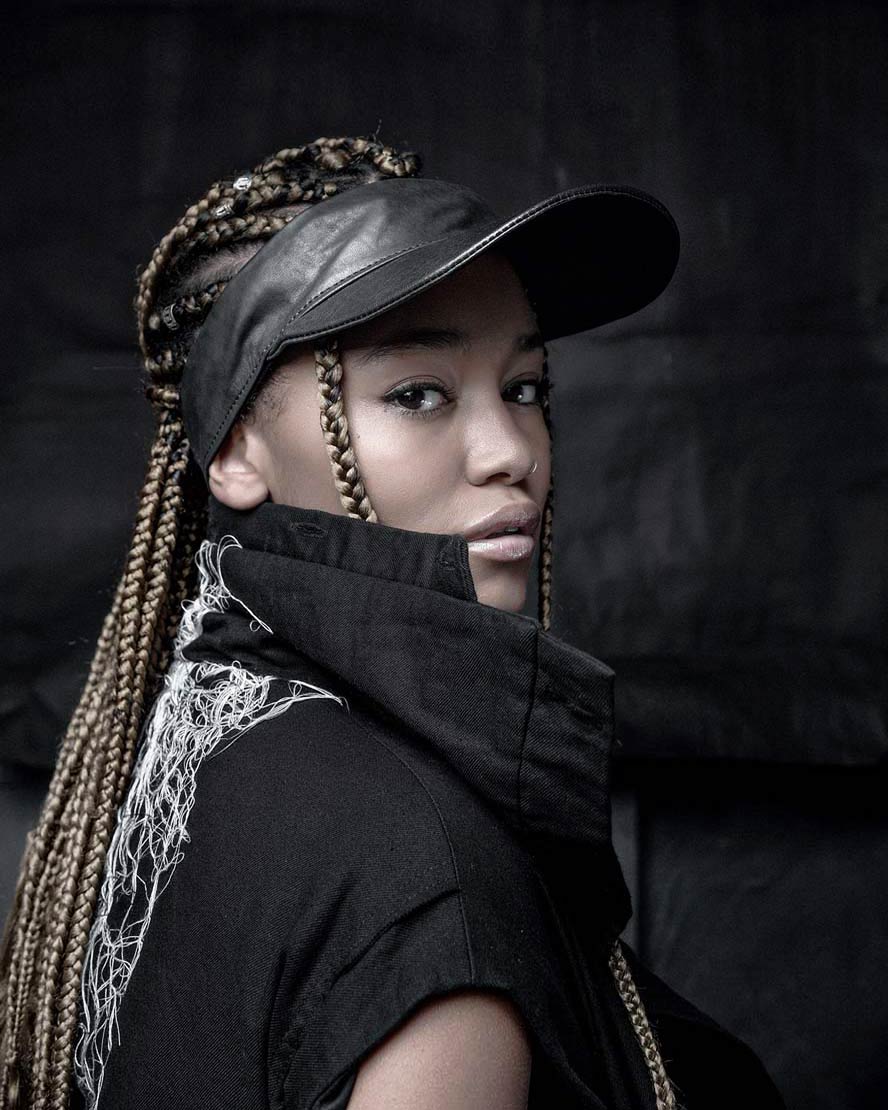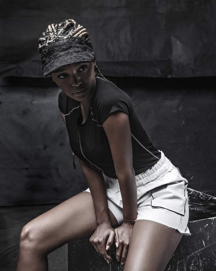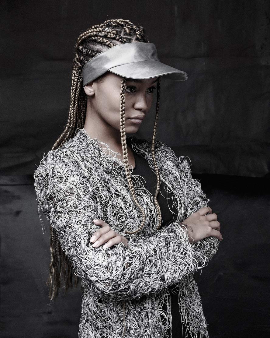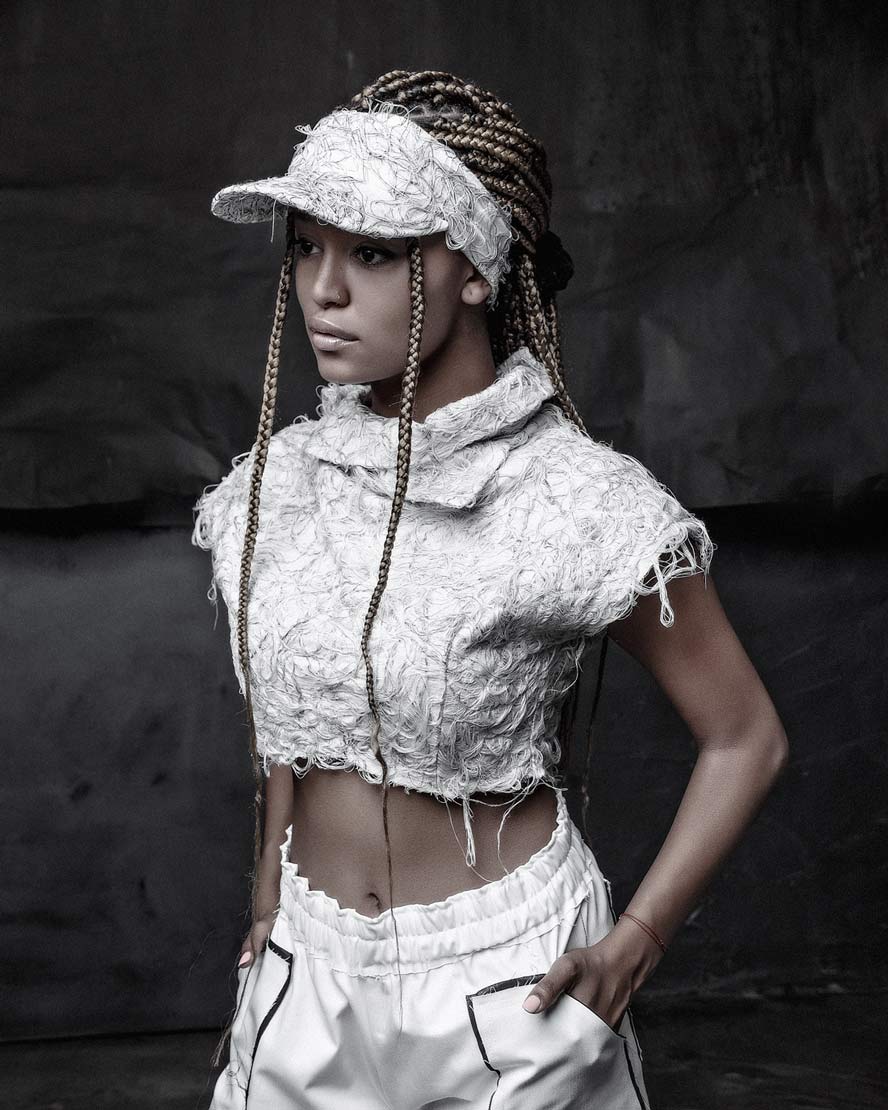The womenswear collection entitled ‘Structure’ comes with a variety of 5 different unisex open top visor hats. A colorless palette unveils the signature technique ‘Fiber Bonding’ in nuanced white, black & white & black fibers, alongside the two silvery grey and black soft leather visor hats.